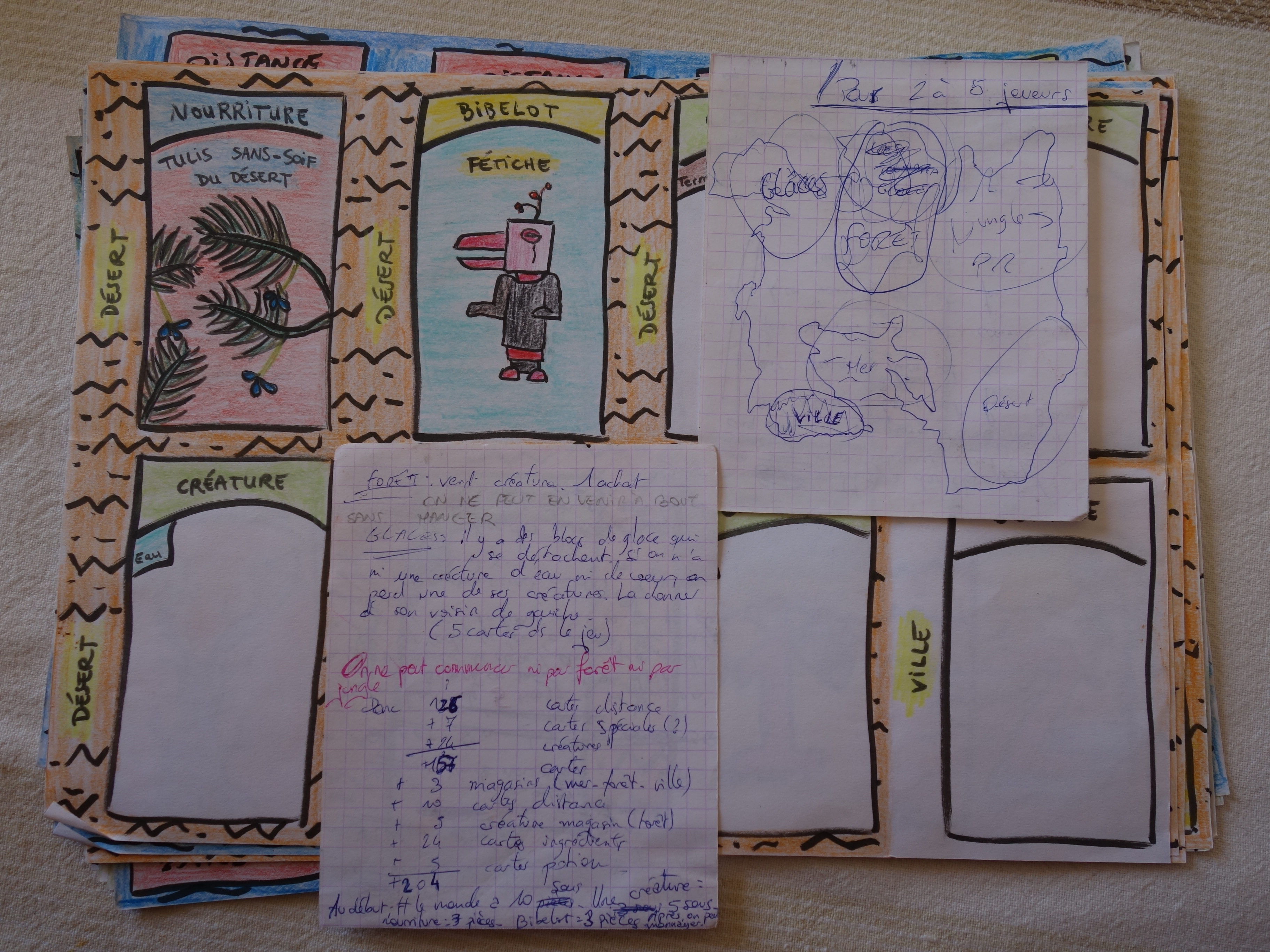 - Un jeu de cartes que j’aimerais bien finaliser, sur des territoires « glaces », « forêt », « jungle », « mer », « ville », « désert ». Il n’y a pas de pouvoir plus petit que les autres, chacun en vainc un autre. Il faut que je me replonge dans les règles :)