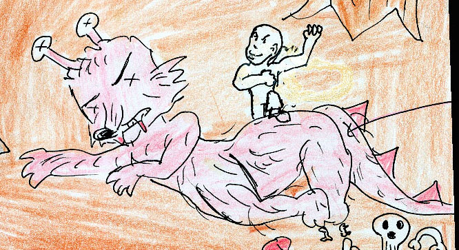 Et, d'un mouvement rapide, tu t'approches de lui, tournes autour sans cesse jusqu'à ce que ses yeux supérieurs s'emmêlent. Il hurle de douleur. A ce moment-là tu le touches à la tête et te concentre.