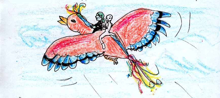 Il te prend par les épaules presque fraternellement. Tu le laisses avoir ce geste familier poussé par le bonheur. Il te fait monter sur un grand oiseau rouge et bleu. Il monte devant toi. L'oiseau s'envole. Tu te retournes et agites le bras en direction de la petite foule en bas. Puis, de petit point noir dans le ciel vous disparaissez. Retour à la maison !