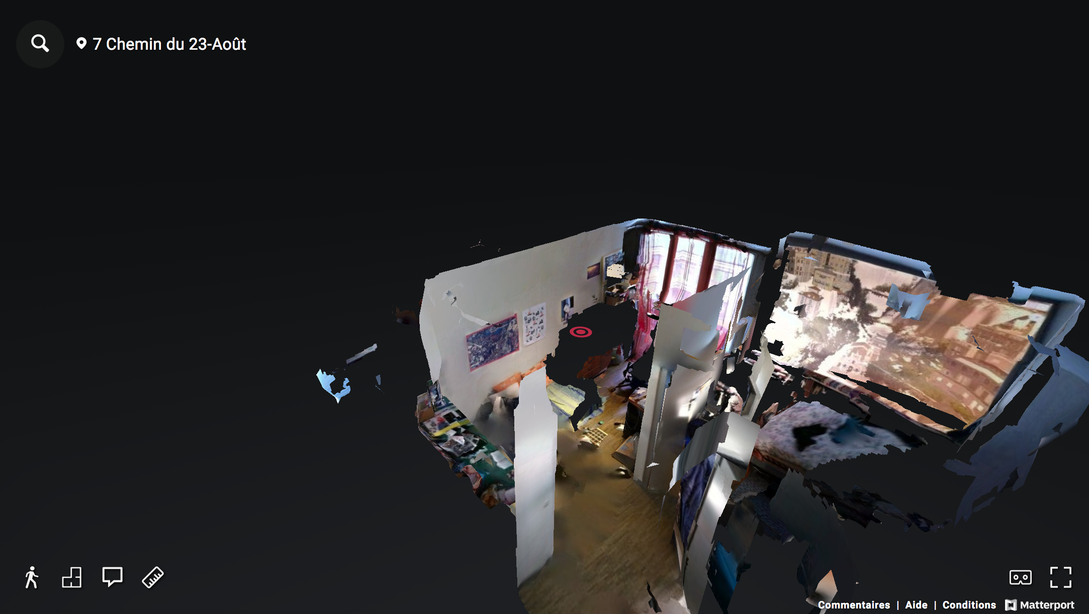 Une fois que c’est fait, on peut travailler le fichier en découpant des parties, en notant les fenêtres, les miroirs, les murs. Puis, quand on uploade sur le site pour générer le modèle 3D, on croise les doigts. Ça prend plusieurs heures, et c’est différent d’une fois à l’autre. C’est l’AI qui gère à partir de nos données. - Repositionnement :