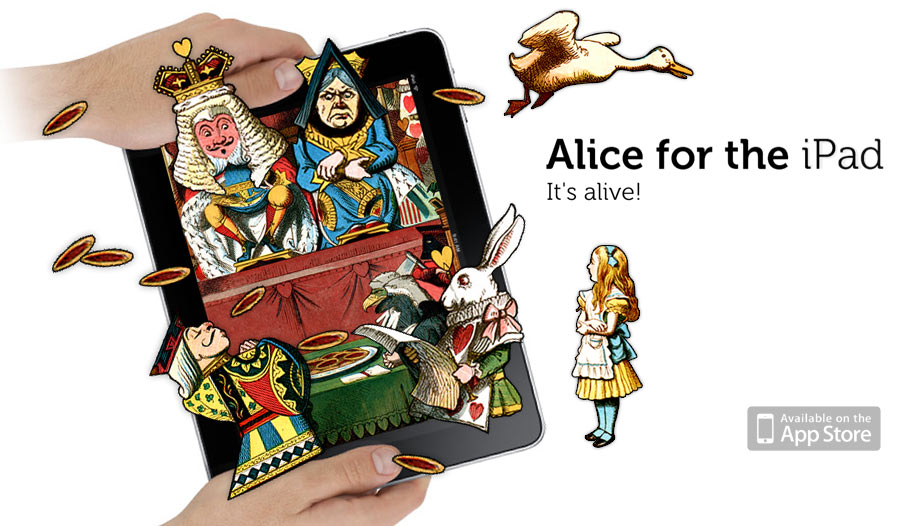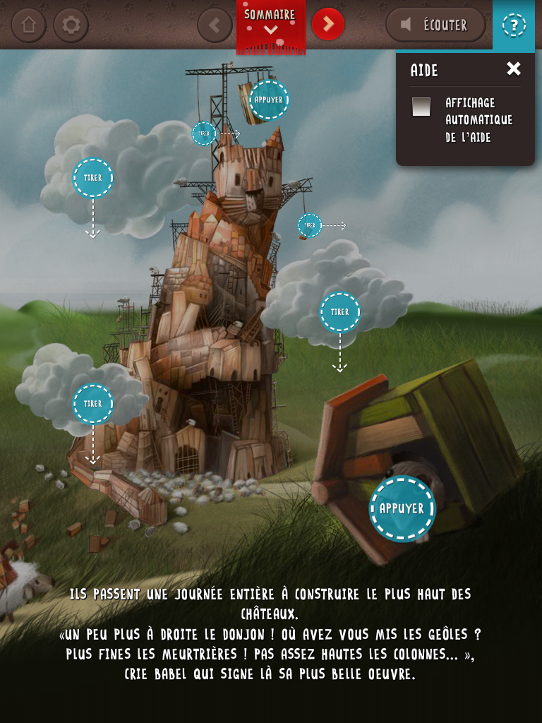 Sommes-nous donc dans une sorte de théâtre de marionnettes, à pouvoir déplacer les coulisses et chatouiller les personnages? Que représente cette manipulation? La métaphore du théâtre pourrait être intéressante. Ouvrir la surface plane de la tablette pour regarder dans cette modélisation d’univers. Mais, encore une fois, que faisons-nous par ce geste? Est-ce que nous les sentons vivre? Est-ce que nous nous réjouissons que la tablette puisse prendre une vie indépendante et nous faire des tours de magie? Le marionnettiste fait se mouvoir les personnages pour leur donner vie aux yeux des spectateurs. Cela pourrait avoir du sens si le manipulateur pouvait aussi insuffler sa propre énergie au personnage, dans le cas d’un rapport de joueur vers un spectateur. Mais dans la plupart des lectures nous sommes seuls face au livre. Pourtant, on retrouve ce genre de «gadget» un peu partout, depuis le «Alice for the iPad» de la société Atomic Antelope (un «livre qui fait pouêt-pouêt» selon Jean-Noël Lafargue) vers «Babel the King» sorti en décembre dernier (pour le coup totalement assumé puisqu’il y en a à toutes les pages), en passant par «Cendrillon» et «les trois petits cochons» de Nosy Crow, édités en France chez Gallimard.