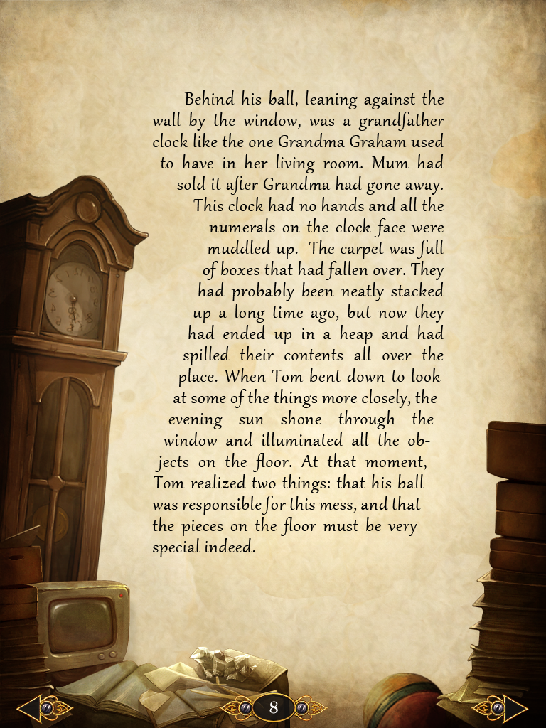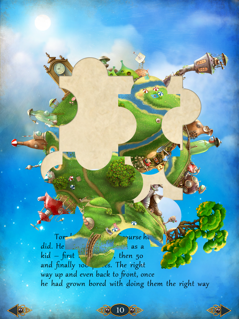 Dans «How Tom recovered time», ce sont des choix étonnants car, globalement on navigue dans un rythme calme. Calme aussi entre les puzzles et le texte, avec en plus ces manipulations que l’on pourrait qualifier de demi-jeux. Les jeux eux-mêmes sont de réflexion, de projection mentale, et ne perturbent pas le statut du lecteur. Ce sont en général les mêmes que dans Tiny Bang Story, simplifiés. Est-ce pour se souvenir des bons moments vécus dans le jeu, ou pour s’y préparer ? Sont-ils destinés au public plus jeune qui lira le livre? Car ils sont presque là pour information, ils ne freinent pas le rythme du récit dans le sens où il n’est pas nécessaire de les résoudre pour atteindre la page suivante, contrairement à la structure de «Tiny Bang Story».