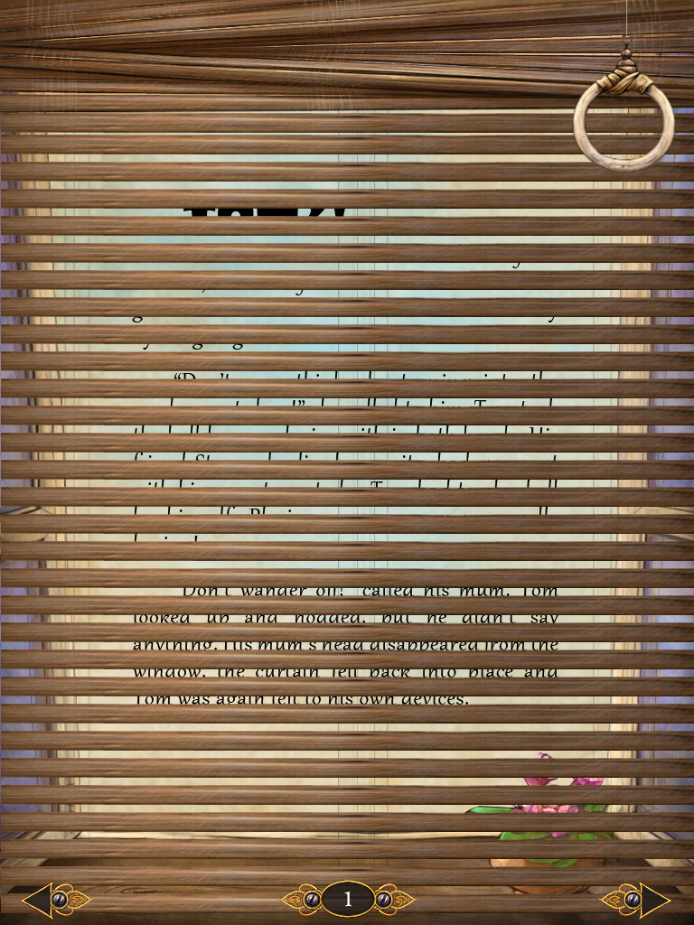Pour conclure, l’écho que fait le livre du jeu est fragile, pas à la hauteur de son origine, mais tout à fait humble. La navigation, composée uniquement de ces flèches avant / arrière, est lacunaire. Le rapport pas tout à fait déterminé entre le texte et les dessins (les dessins illustrent parfois le texte, parfois le texte fait partie du décor) fait que l’on ne sent pas un choix éditorial. Ainsi, quelques éléments sont de trop, ou n’ont pas encore trouvé pleinement leur rôle : les objets à déplacer sur la page en est un autre exemple. Cette étrange volonté, commune à beaucoup de livres numériques, de donner l’occasion au lecteur de manipuler des éléments du livre gratuitement, sans but scénaristique, montre que les auteurs du livre n’ont pas pleinement déterminé quel statut lui donner.