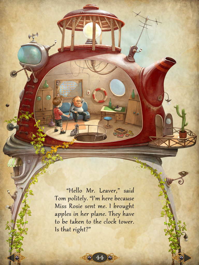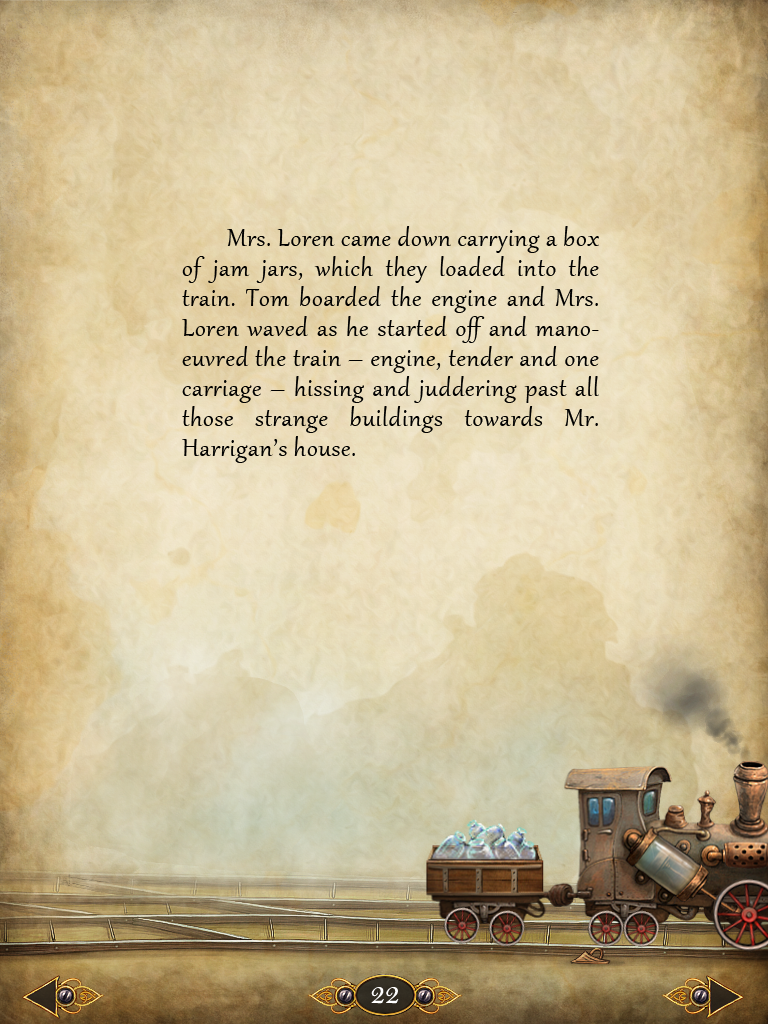 Nos gestes amènent plusieurs retours de la machine : tout d’abord, si l’on tente de manipuler quelque chose, une traînée de comète s’inscrit sur le passage de notre doigt. Ce visuel nous indique une réaction de la machine à notre tentative d’interaction, mais informe aussi qu’il n’y a rien (elle ne reste pas insensible au toucher) et nous rassure sur notre capacité à communiquer avec la machine. D’un côté, les intentions du lecteur sont d’avancer à son rythme dans la narration, de l’autre, celles de l’auteur sont de lui signifier les différentes manières de le faire. Il est toujours délicat de figurer au lecteur quels sont les éléments à toucher. Dans les jeux vidéo d’aventure, se caractérisant par l’exploration, c’est justement un des éléments constitutionnels du game design. Dans une narration de type «livre», ça ne marche pas quand il s’agit d’un élément superflu. J’en parlerais un peu plus bas. Dans «How Tom recovered time», un bouton ressemble à un bouton, on ne touche pas partout pour voir ce qui va se passer. Il y a parfois quelques éléments qui réagissent sous les impacts de notre curiosité : le train qui va se mettre en marche, la porte qui s’ouvrira, etc… Mais, n’ayant pas de portée sur l’histoire, ils ne sont pas systématiques. Les flèches pour tourner les pages sont des éléments significatifs, les jeux montrent qu’ils sont des jeux, et quand des éléments sont à déplacer sur les pages, c’est qu’ils gênaient la lecture. Ils amènent effectivement le lecteur à les écarter.