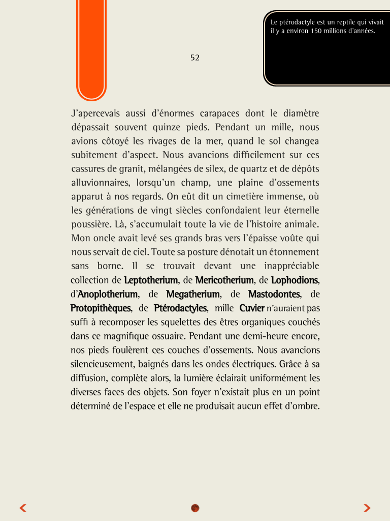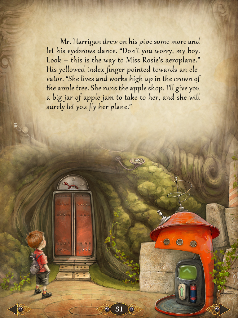 Dans le jeu, soit des portes, soit des flèches sur le côté en bas permettent de passer entre les différents écrans. Elles font partie du décor. Dans le livre, elles sont une navigation en plus, avec une décoration steampunk souhaitant les associer à l’univers du livre. À l’instar d’autres ouvrages comme «Voyage au centre de la Terre» édité par l’Apprimerie, la négligence du swipe horizontal est donc délaissé pour la rigueur du bouton.