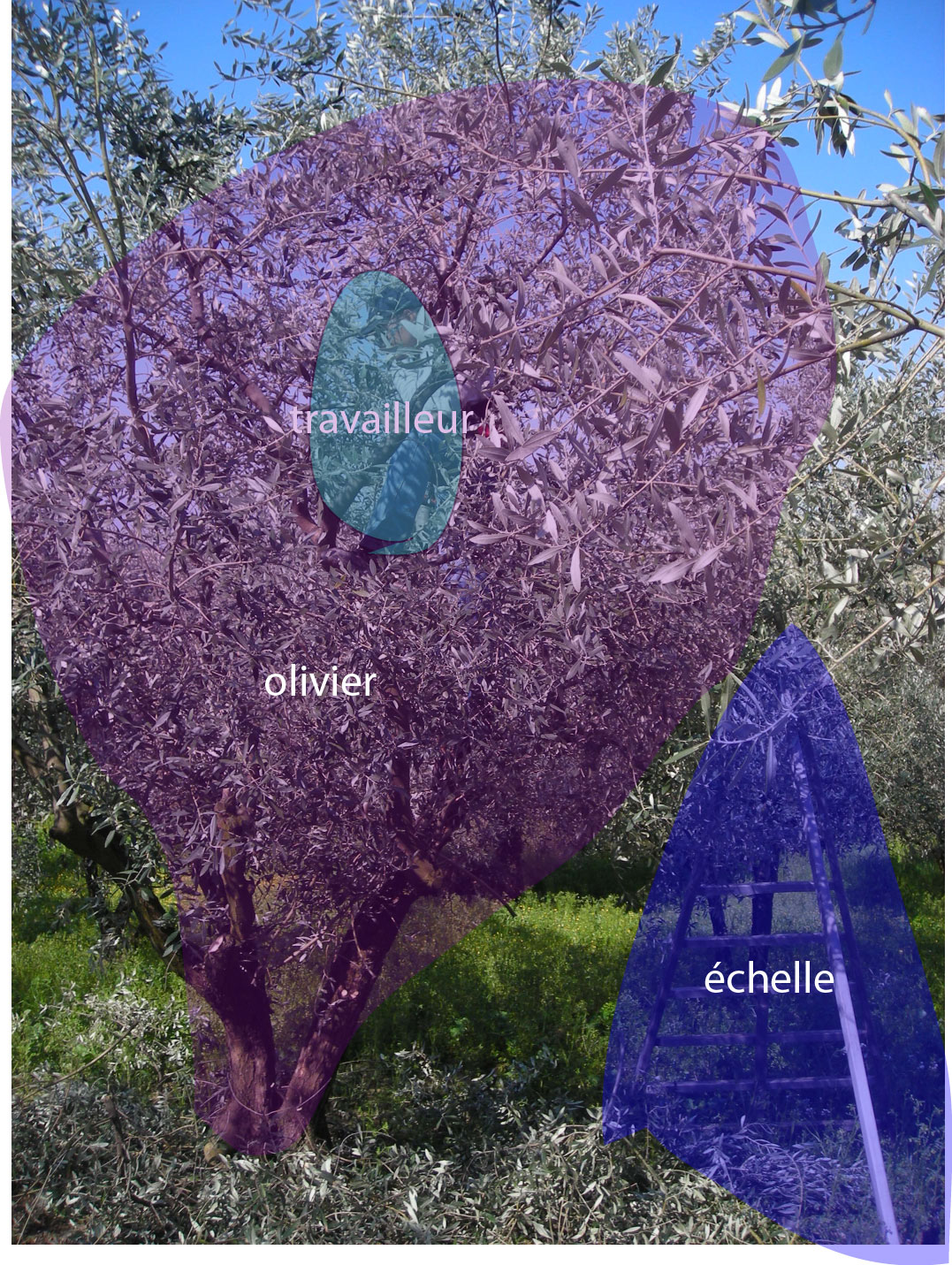 Either an analogical dictionary. Or a way to read a picture. Or a library of words springing from images to compose poems. Or a plastic proposition. In any case, a way to enhance the picture. When we touch a key element of the picture, words, which are associated to this object, deploy themselves around it. The image-element becomes a word (“house”, “tree”, “mountain”), bubble that contain a vocabulary. Example with “dog” : Enraged, to wag his tail, to bark, paws, to sniff; fangs; hungry; animal ; best friend: punk; factor; Lassie; Rantanplan; going to the ; life; police; rage; canine; home; protection ; to attack; lead, crap, guide ; hair.