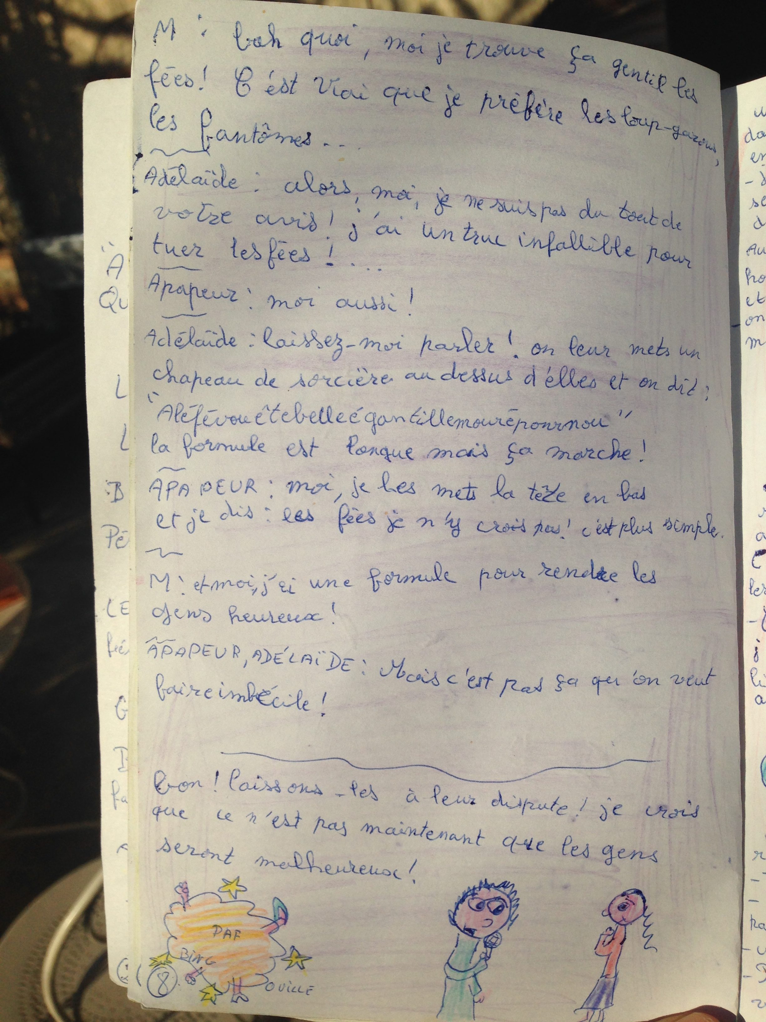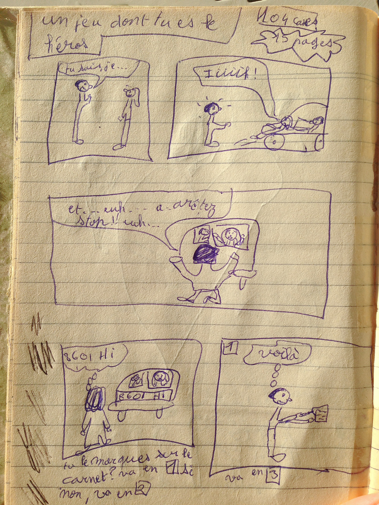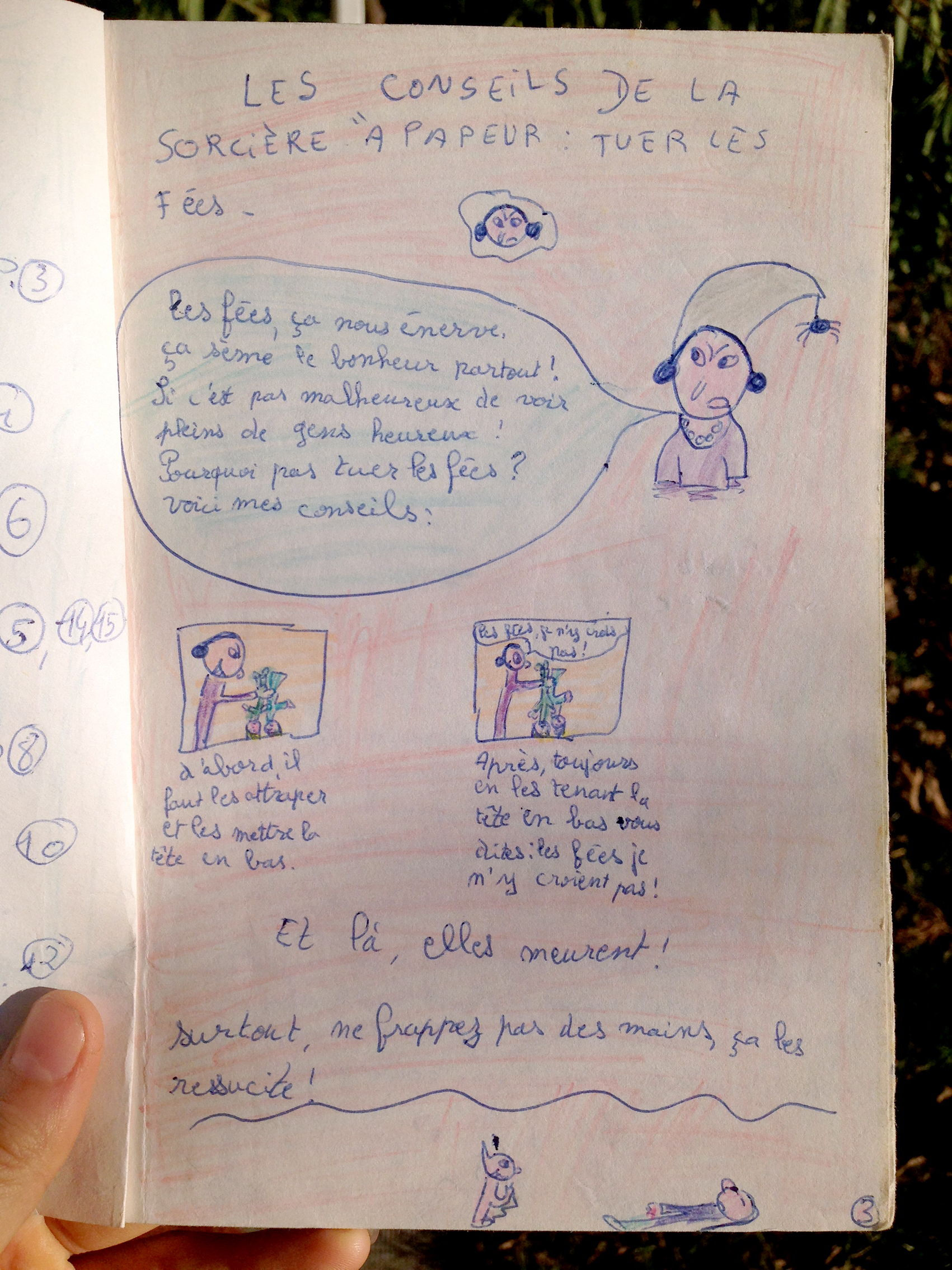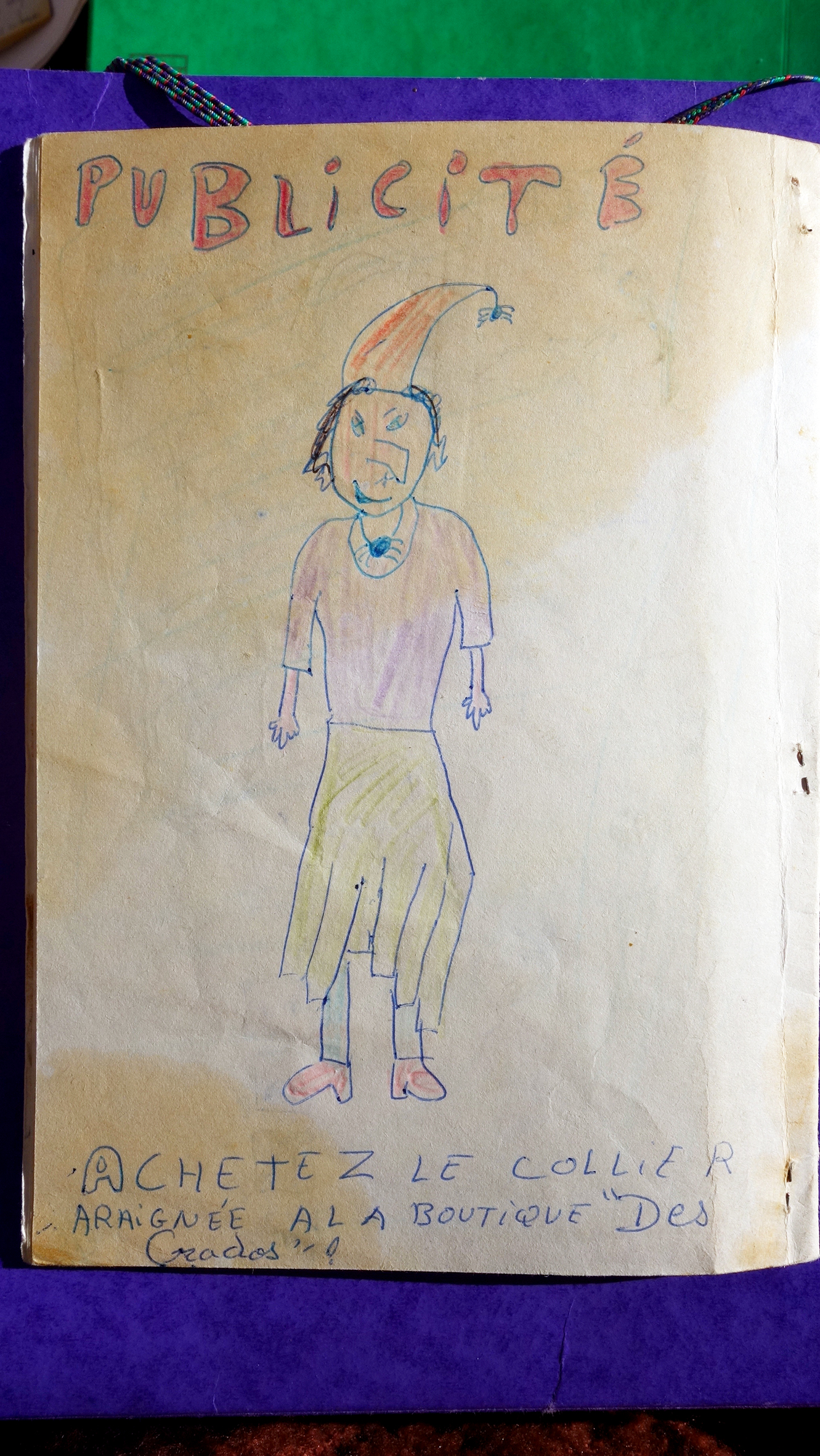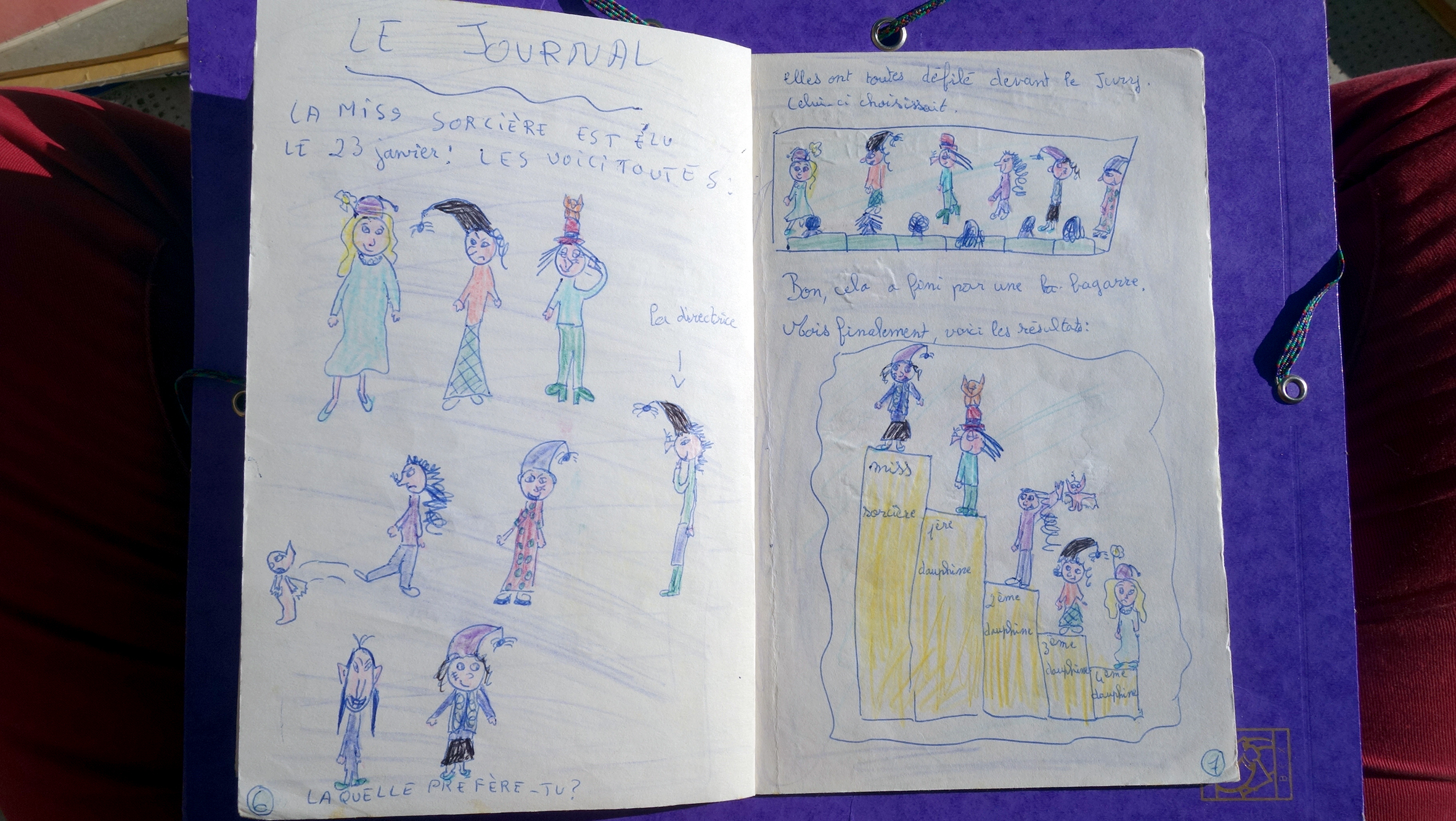 Et cette année, j’ai plutôt décidé de plonger dans mes carnets d’enfance et de les prendre en photo pour te les envoyer! J’en ai beaucoup beaucoup, j’ai tout gardé, dans une bibliothèque qui transpire la cire d’abeille et les fait jaunir. Des carnets, mais aussi des papiers dans des classeurs, des magazines faits avec des feuilles A4 agrafés, etc. Je ne sais pas toi, mais je ne suis pas hyper soigneuse, alors tous mes bricolages sont faits essentiellement avec du papier, des agrafes et du scotch :D rien de très joli. Mais les histoires que je racontais étaient de bonnes idées, je trouve. Je regarde à nouveau toutes ces idées, ces dessins, ces blagues, et je trouve des thématiques que je continue encore à travailler! Il y a même des choses où je me dis « tiens, mais c’est pas mal, je devrais le reprendre »…