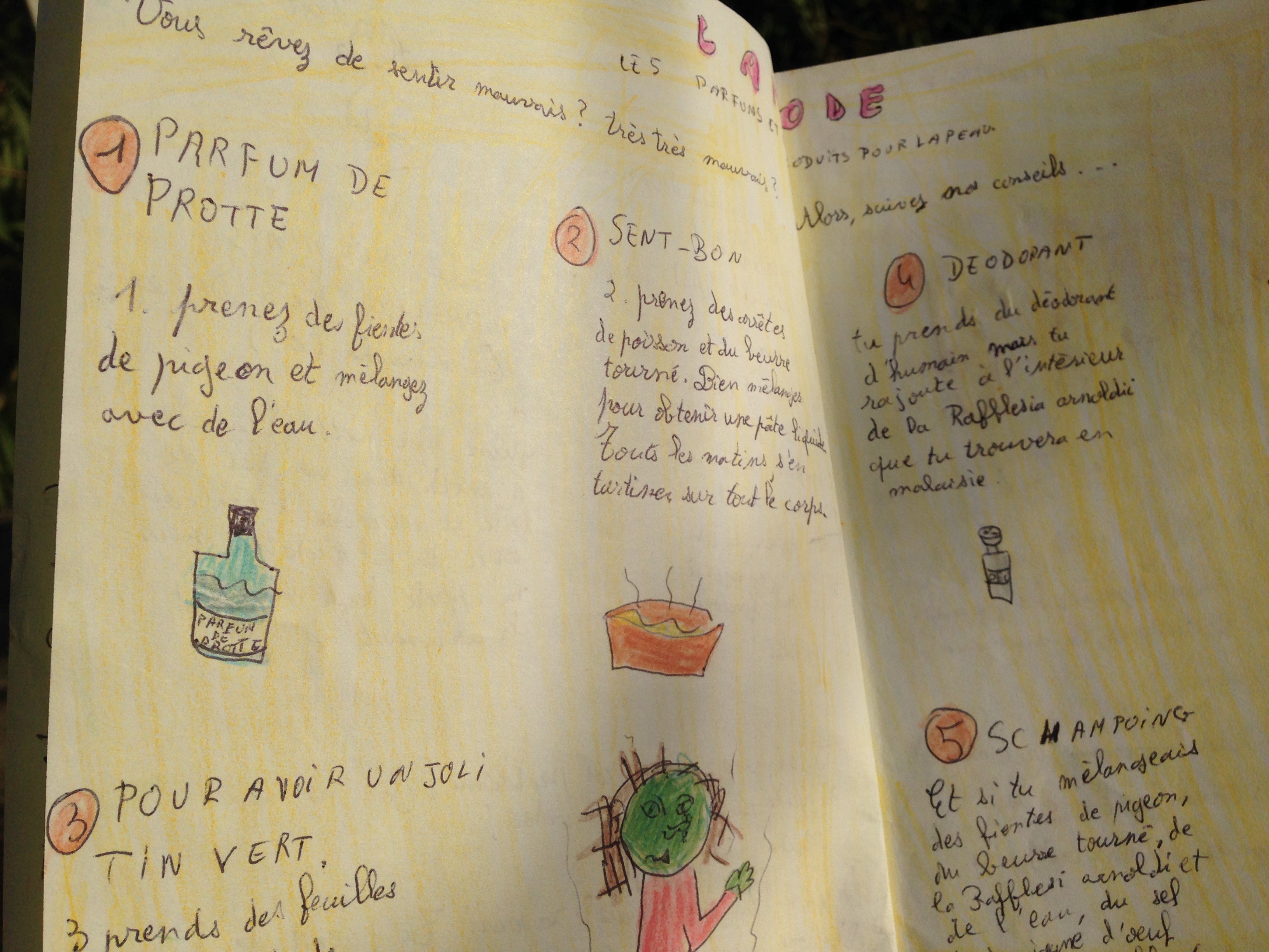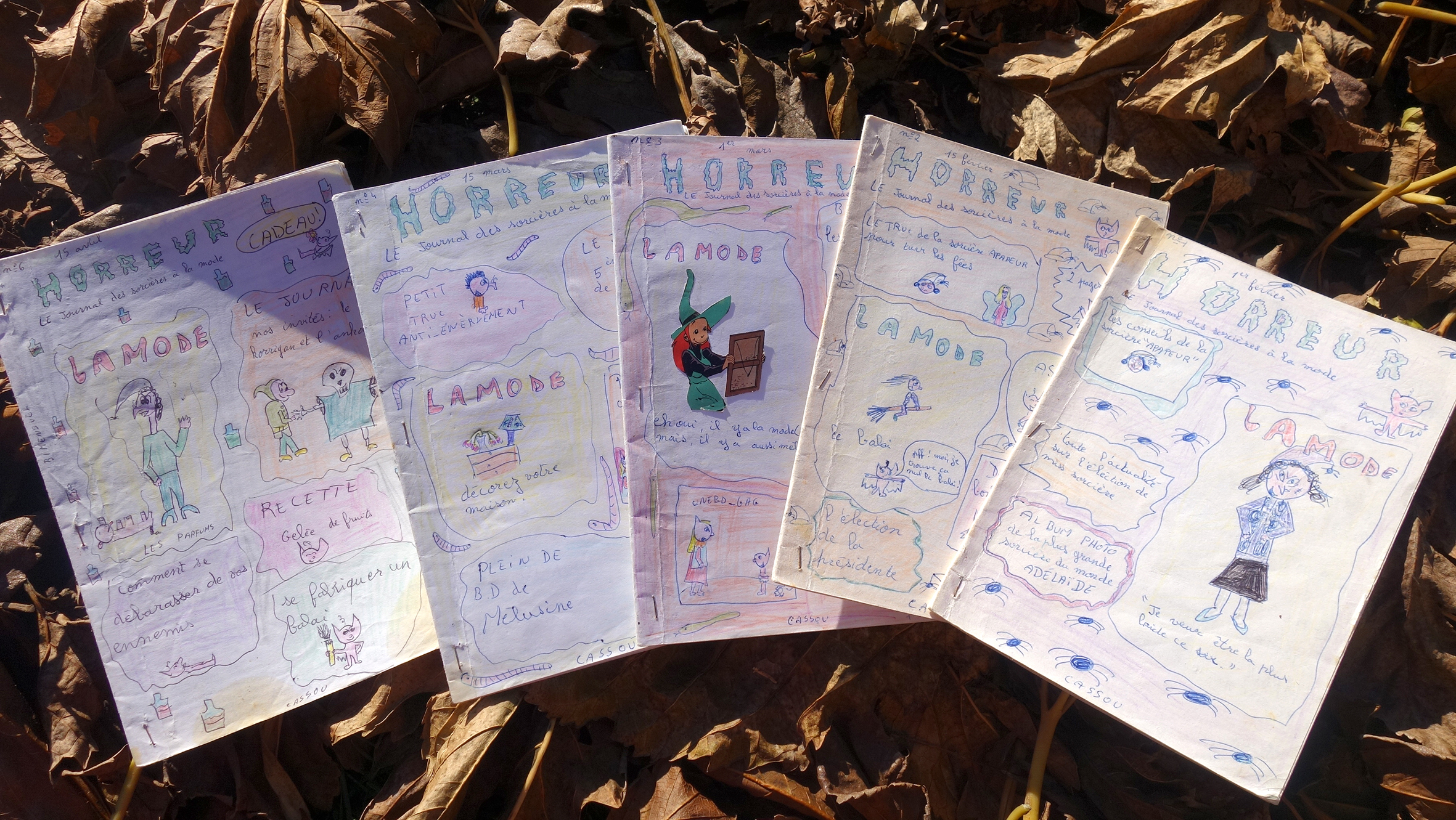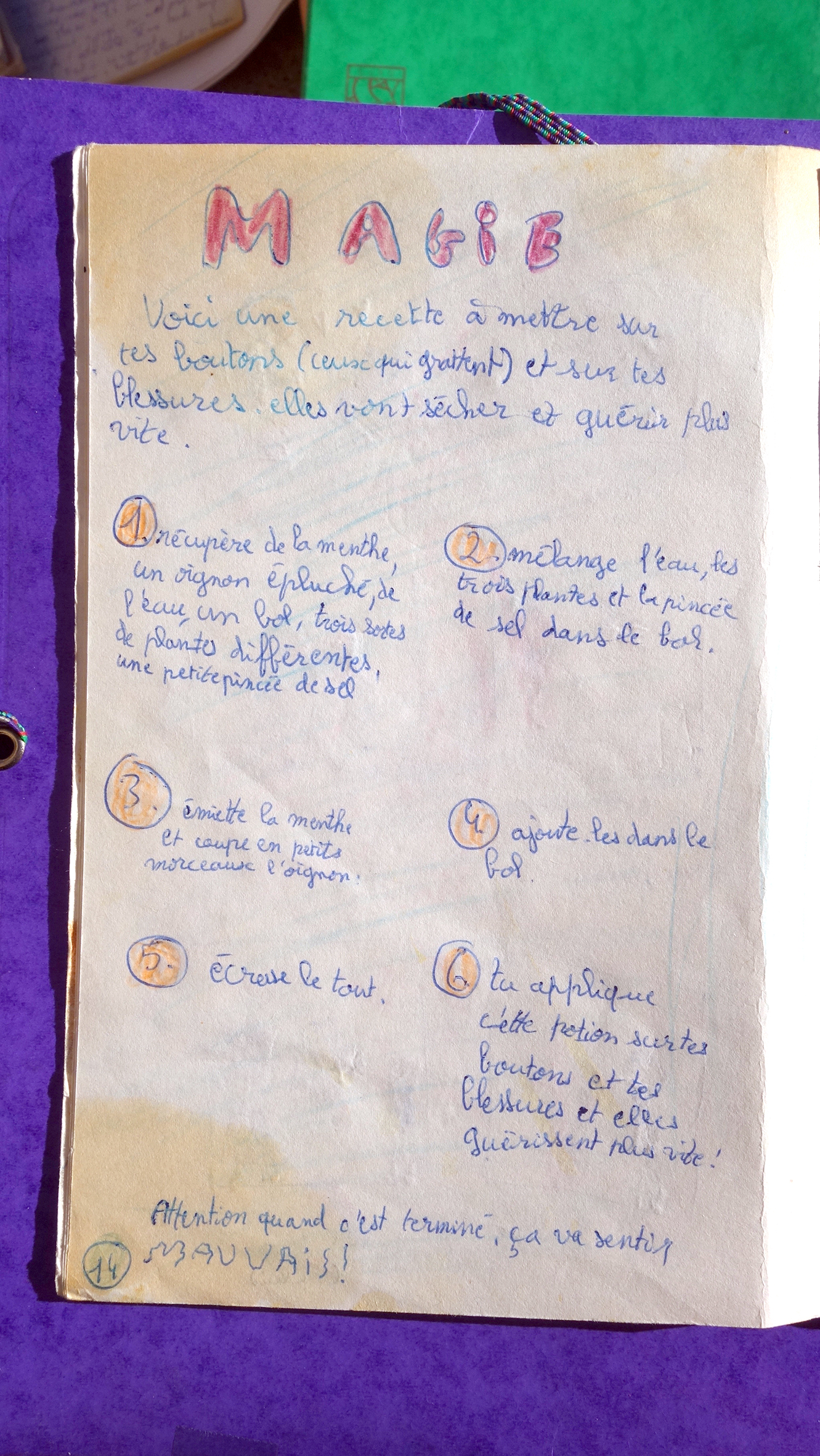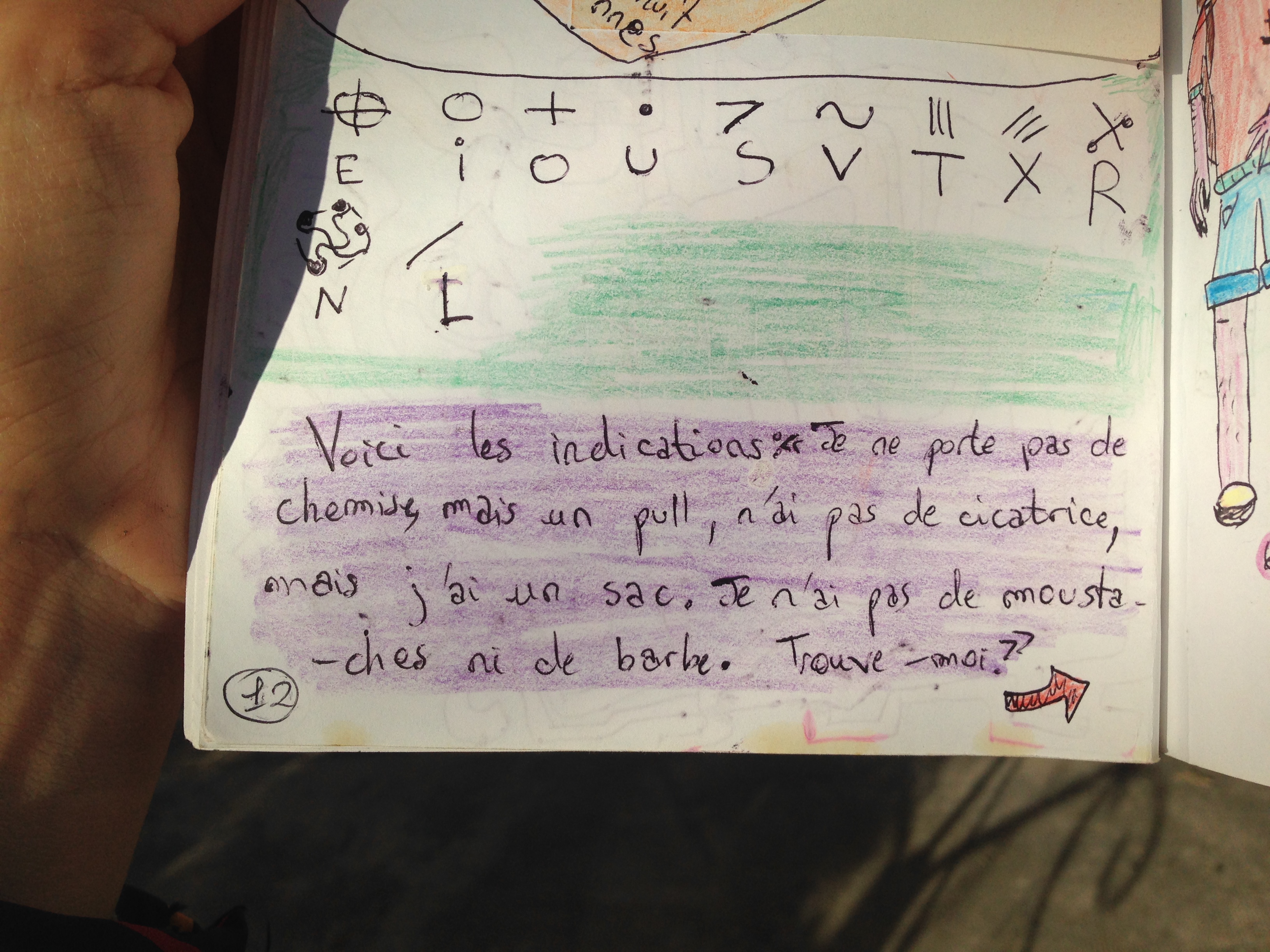 Et cette année, j’ai plutôt décidé de plonger dans mes carnets d’enfance et de les prendre en photo pour te les envoyer! J’en ai beaucoup beaucoup, j’ai tout gardé, dans une bibliothèque qui transpire la cire d’abeille et les fait jaunir. Des carnets, mais aussi des papiers dans des classeurs, des magazines faits avec des feuilles A4 agrafés, etc. Je ne sais pas toi, mais je ne suis pas hyper soigneuse, alors tous mes bricolages sont faits essentiellement avec du papier, des agrafes et du scotch :D rien de très joli. Mais les histoires que je racontais étaient de bonnes idées, je trouve. Je regarde à nouveau toutes ces idées, ces dessins, ces blagues, et je trouve des thématiques que je continue encore à travailler! Il y a même des choses où je me dis « tiens, mais c’est pas mal, je devrais le reprendre »…