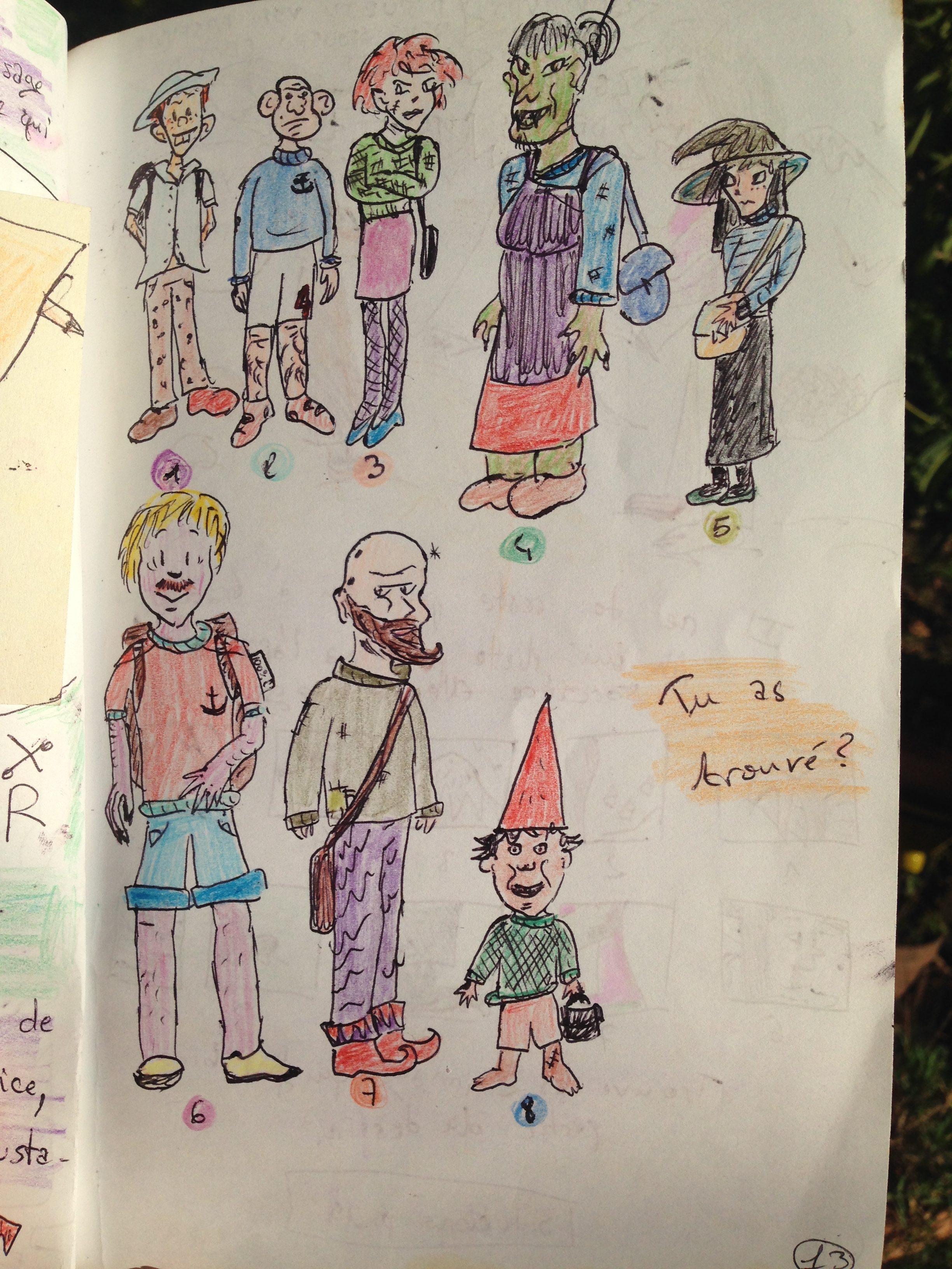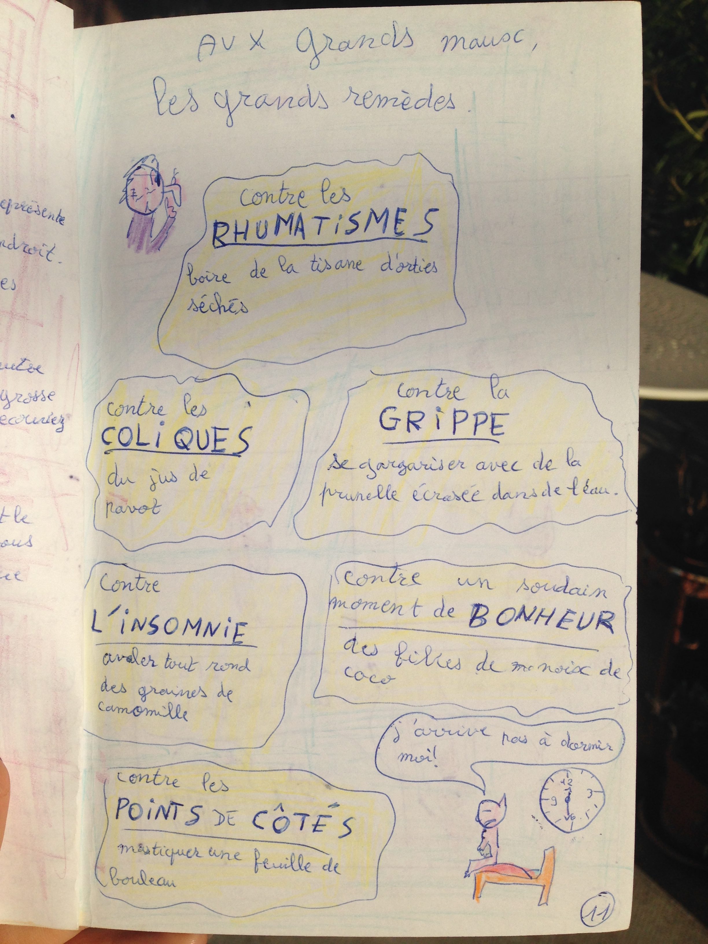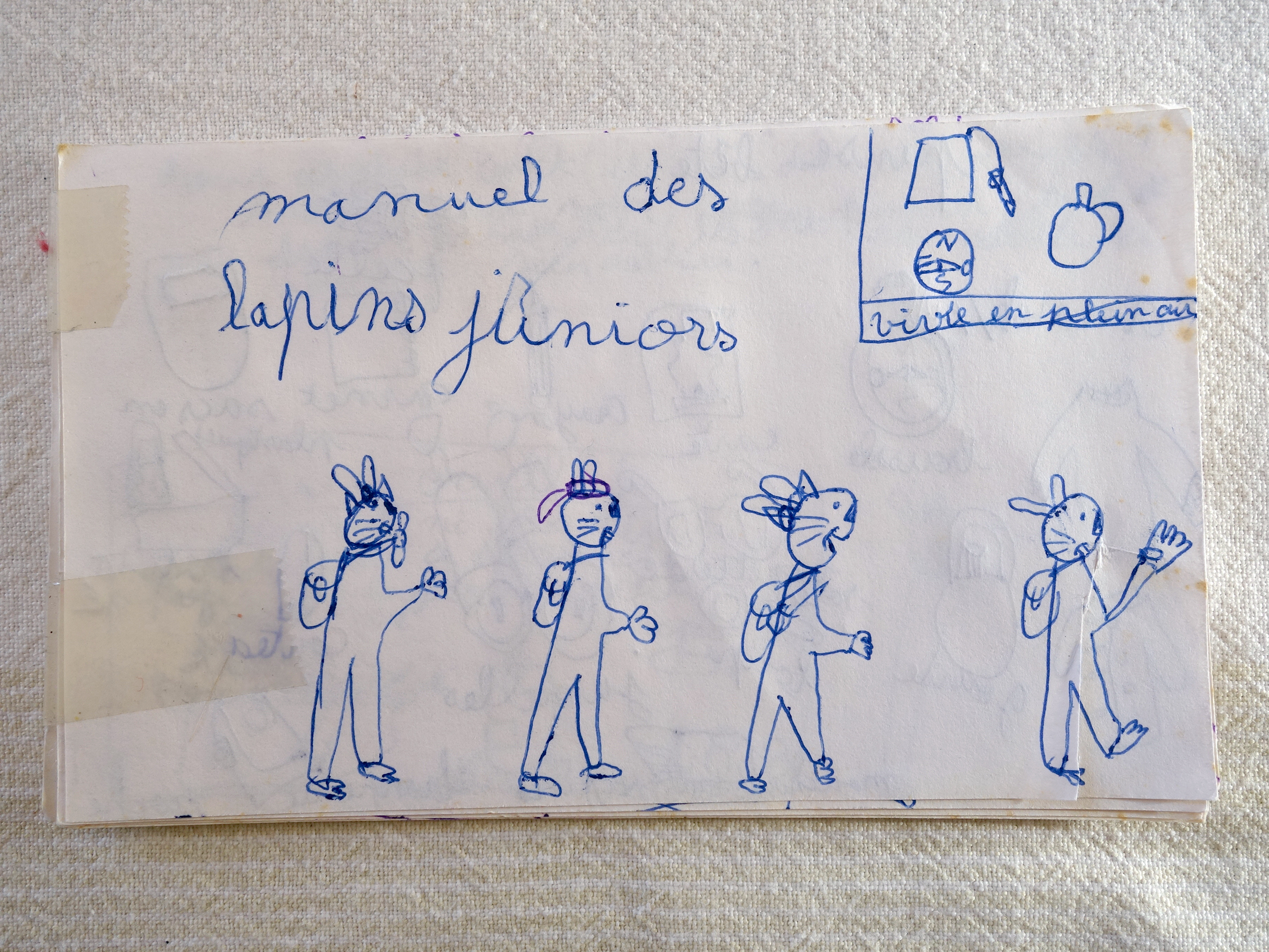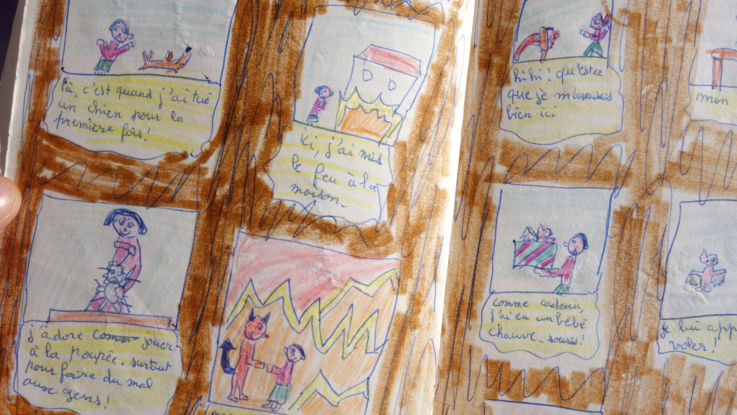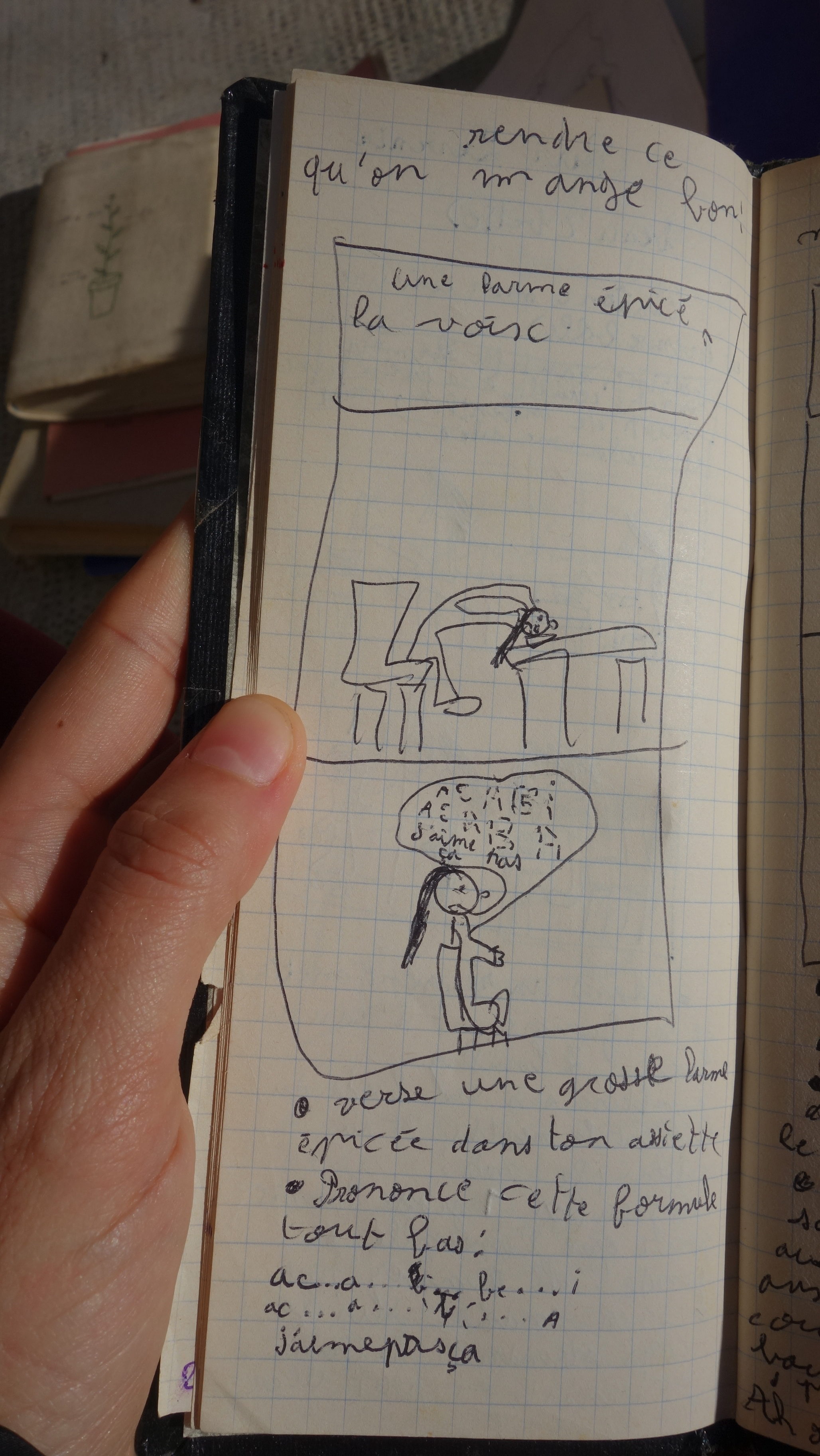 Et cette année, j’ai plutôt décidé de plonger dans mes carnets d’enfance et de les prendre en photo pour te les envoyer! J’en ai beaucoup beaucoup, j’ai tout gardé, dans une bibliothèque qui transpire la cire d’abeille et les fait jaunir. Des carnets, mais aussi des papiers dans des classeurs, des magazines faits avec des feuilles A4 agrafés, etc. Je ne sais pas toi, mais je ne suis pas hyper soigneuse, alors tous mes bricolages sont faits essentiellement avec du papier, des agrafes et du scotch :D rien de très joli. Mais les histoires que je racontais étaient de bonnes idées, je trouve. Je regarde à nouveau toutes ces idées, ces dessins, ces blagues, et je trouve des thématiques que je continue encore à travailler! Il y a même des choses où je me dis « tiens, mais c’est pas mal, je devrais le reprendre »…