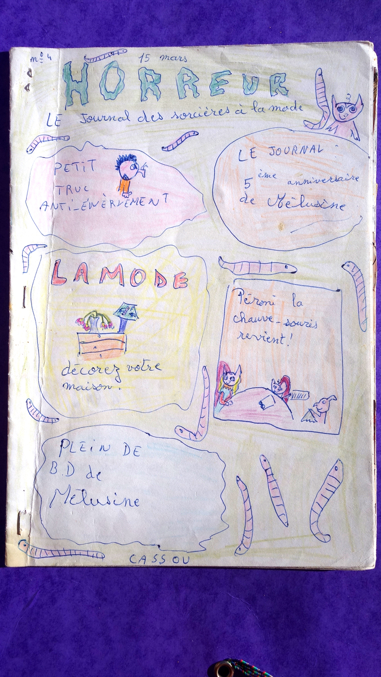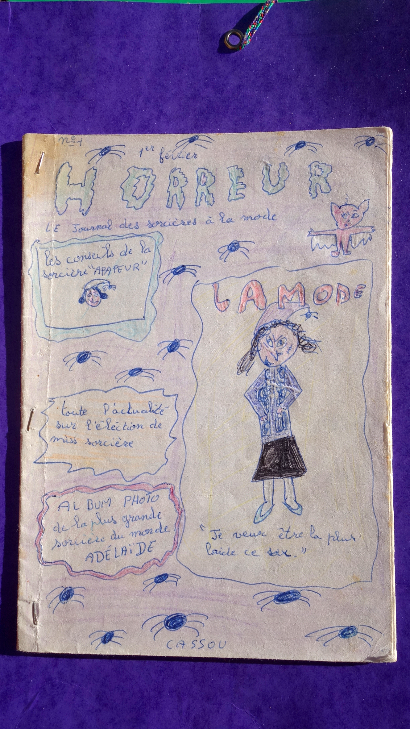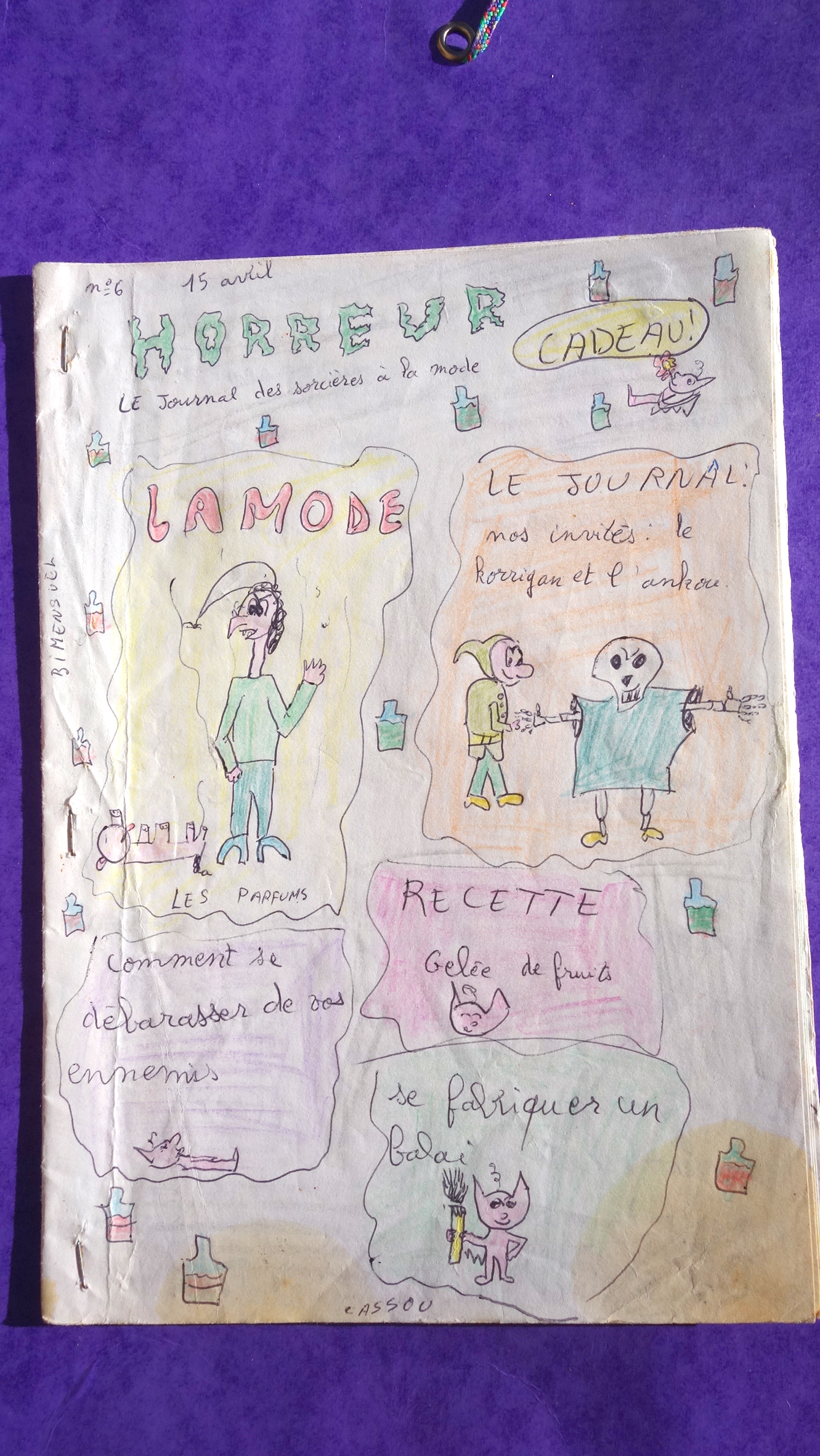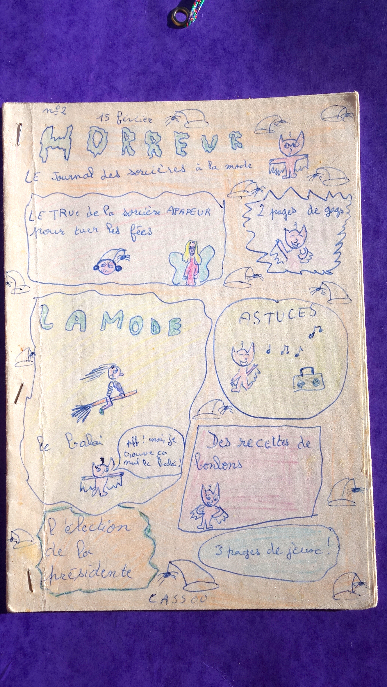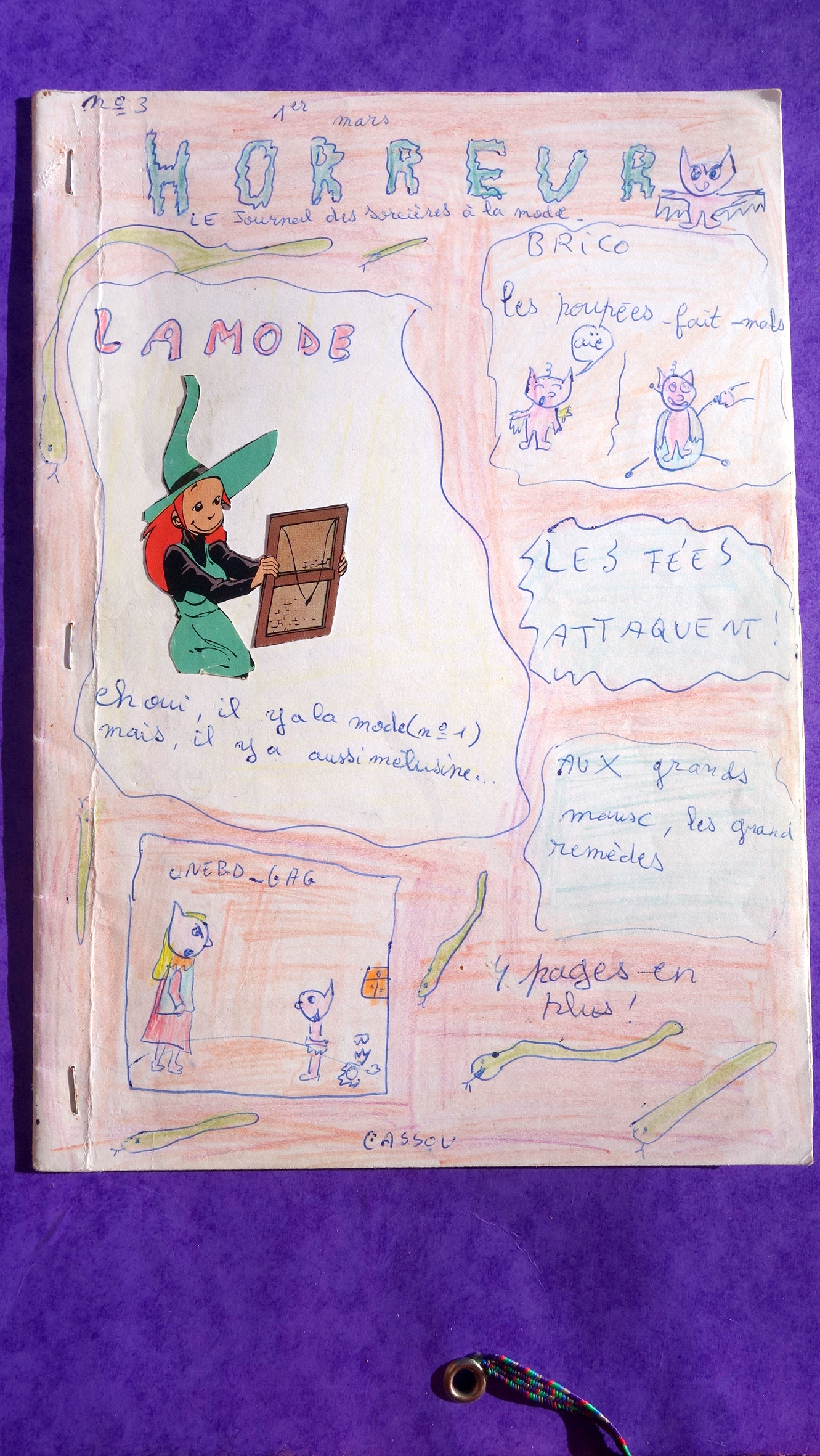 C’est ainsi qu’il y a eu la période « sorcières » : j’ai rédigé d’abord quelques pages de formules magiques dans un petit carnet quand j’avais peut-être 7 ans, puis quand j’avais 10 ans, un journal qui s’appelait « HORREUR, le journal des sorcières à la mode », qui a eu 6 parutions (j’en ai perdue une), puis que j’ai repris à 14 ans.