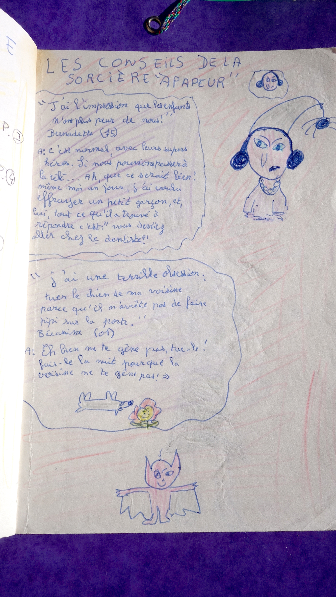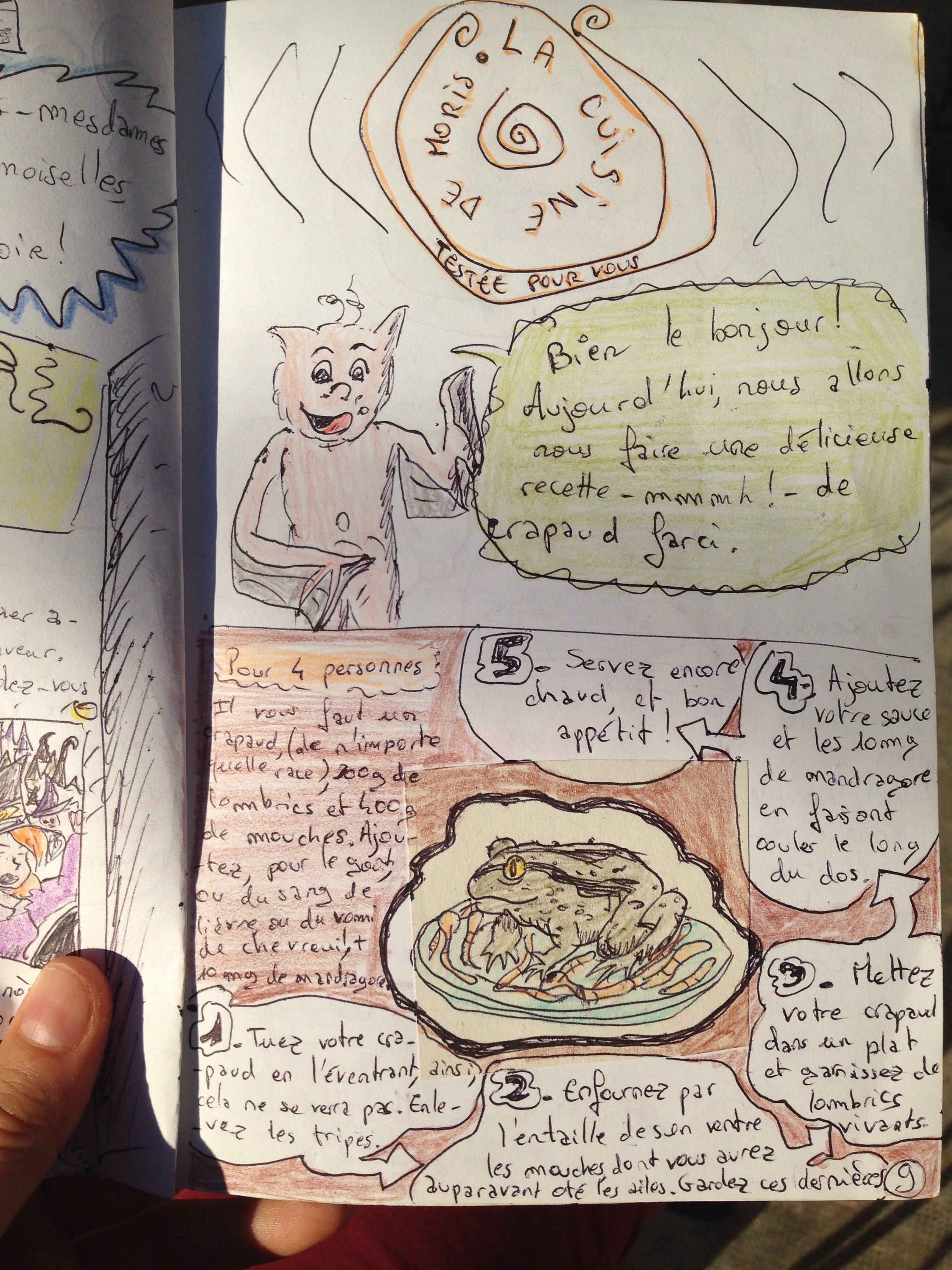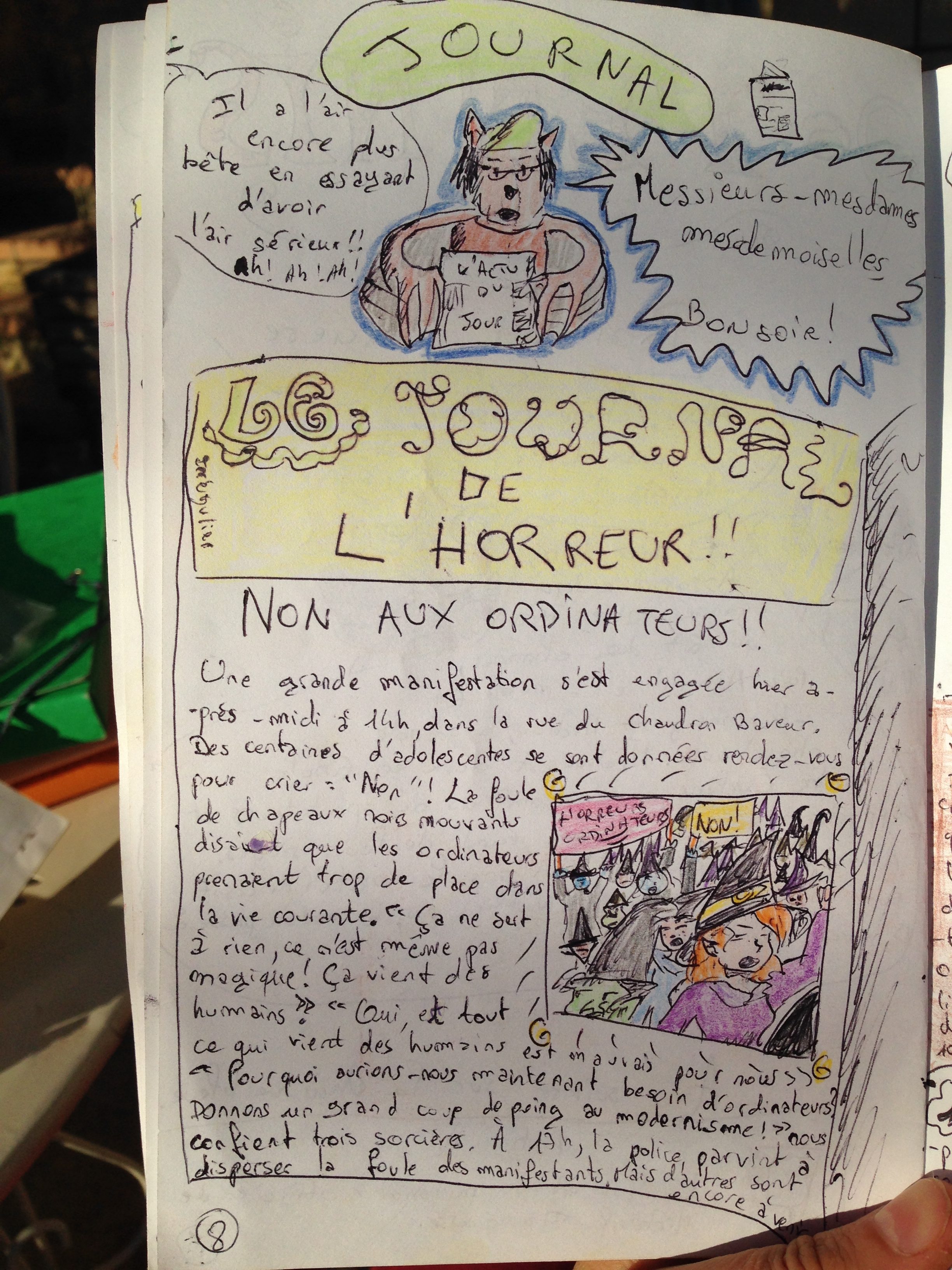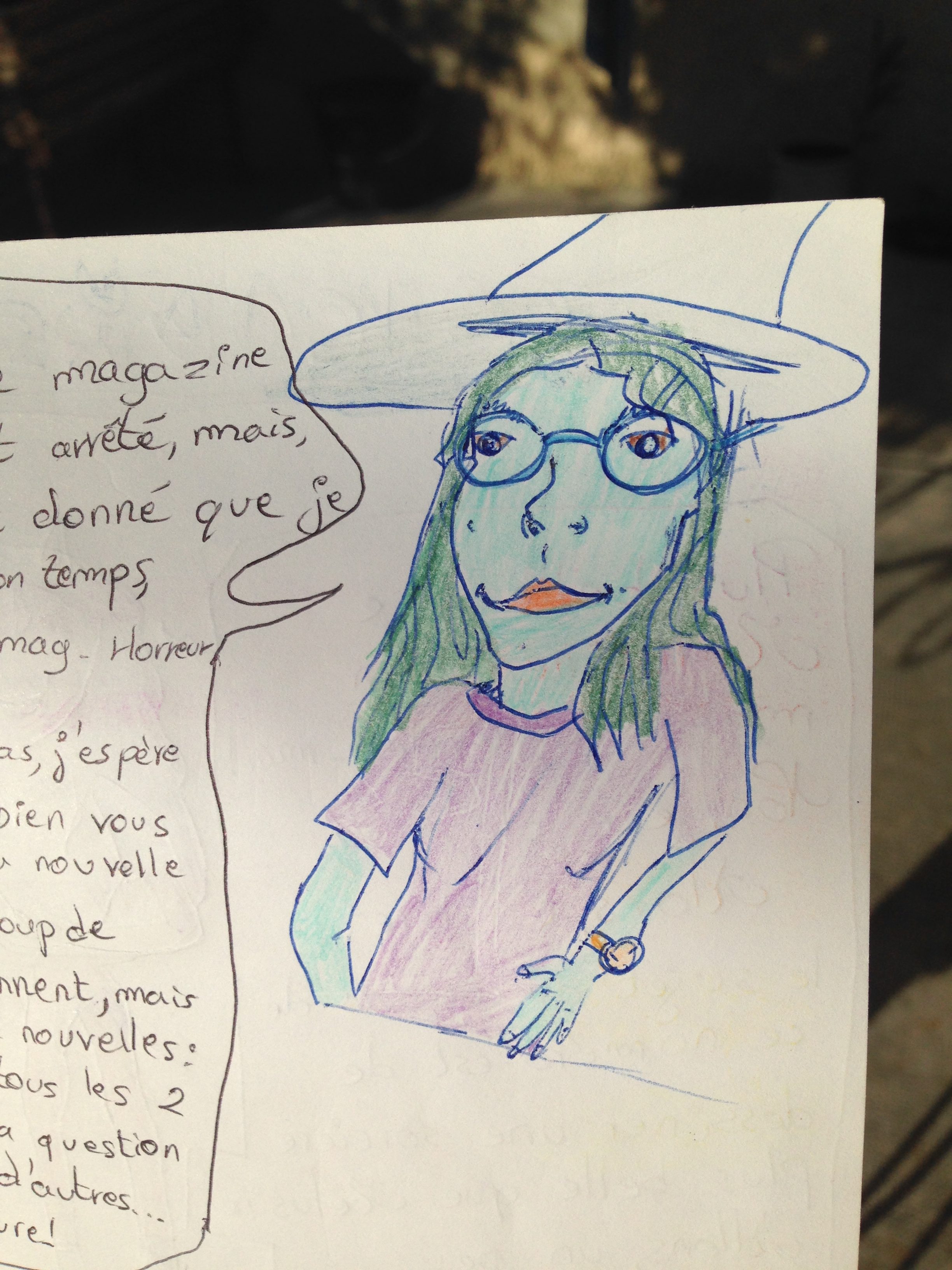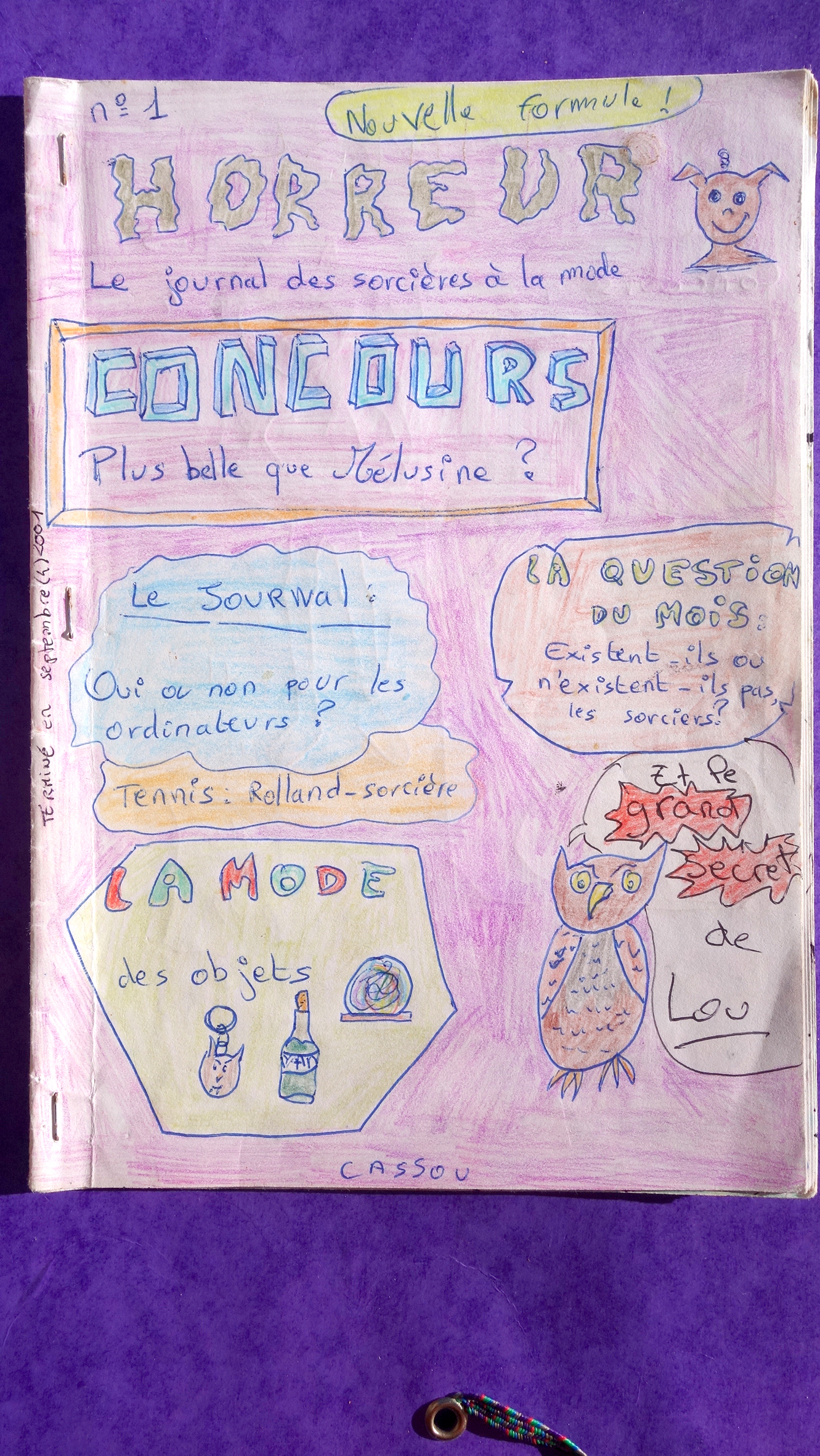 C’est ainsi qu’il y a eu la période « sorcières » : j’ai rédigé d’abord quelques pages de formules magiques dans un petit carnet quand j’avais peut-être 7 ans, puis quand j’avais 10 ans, un journal qui s’appelait « HORREUR, le journal des sorcières à la mode », qui a eu 6 parutions (j’en ai perdue une), puis que j’ai repris à 14 ans.