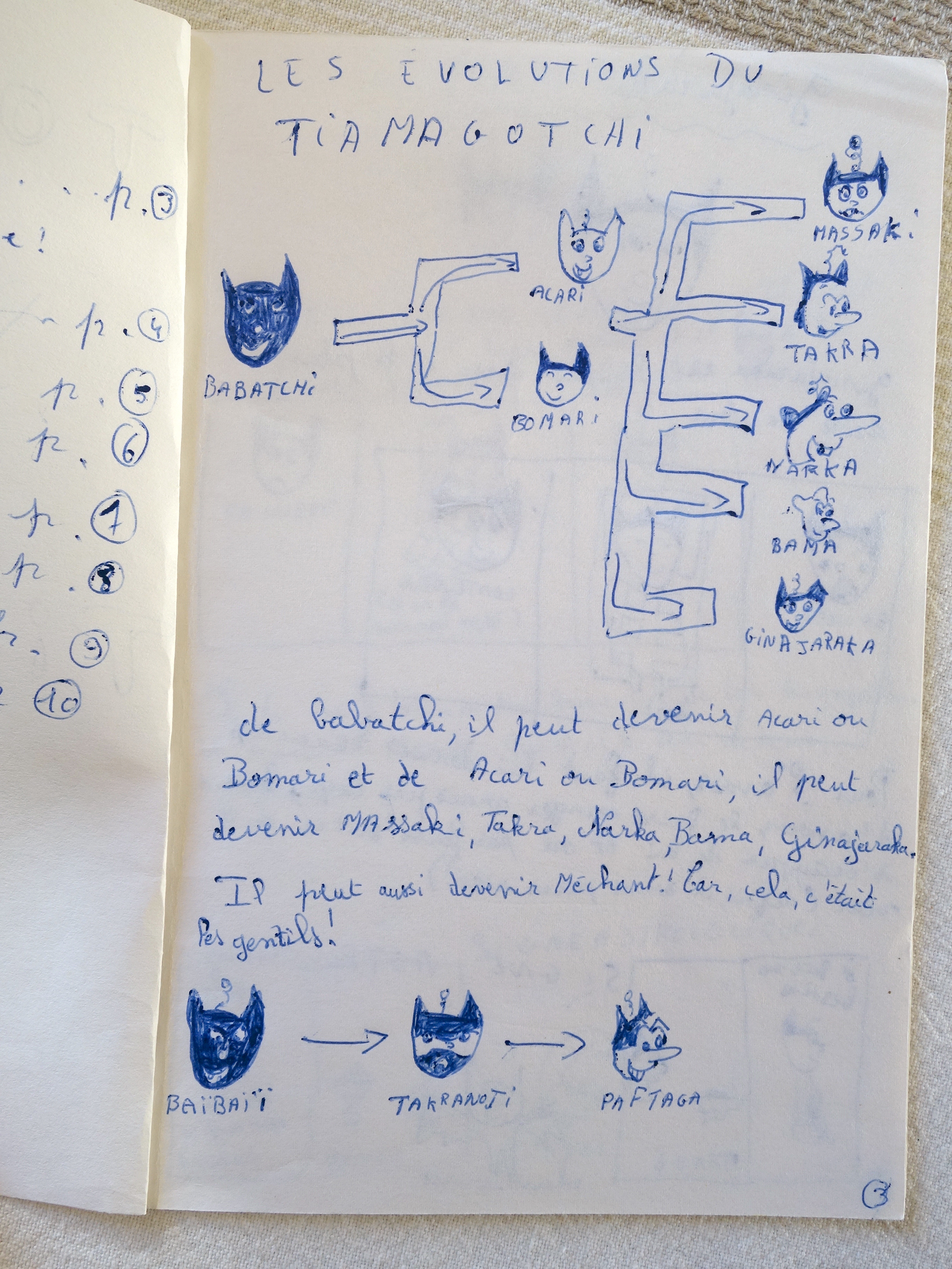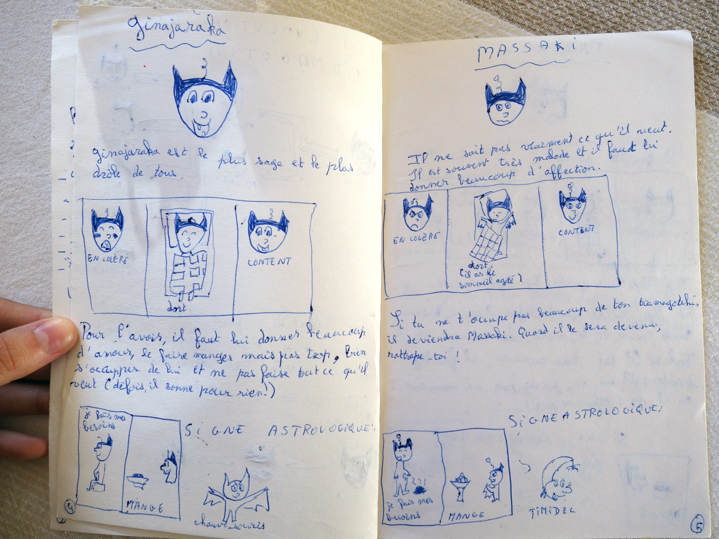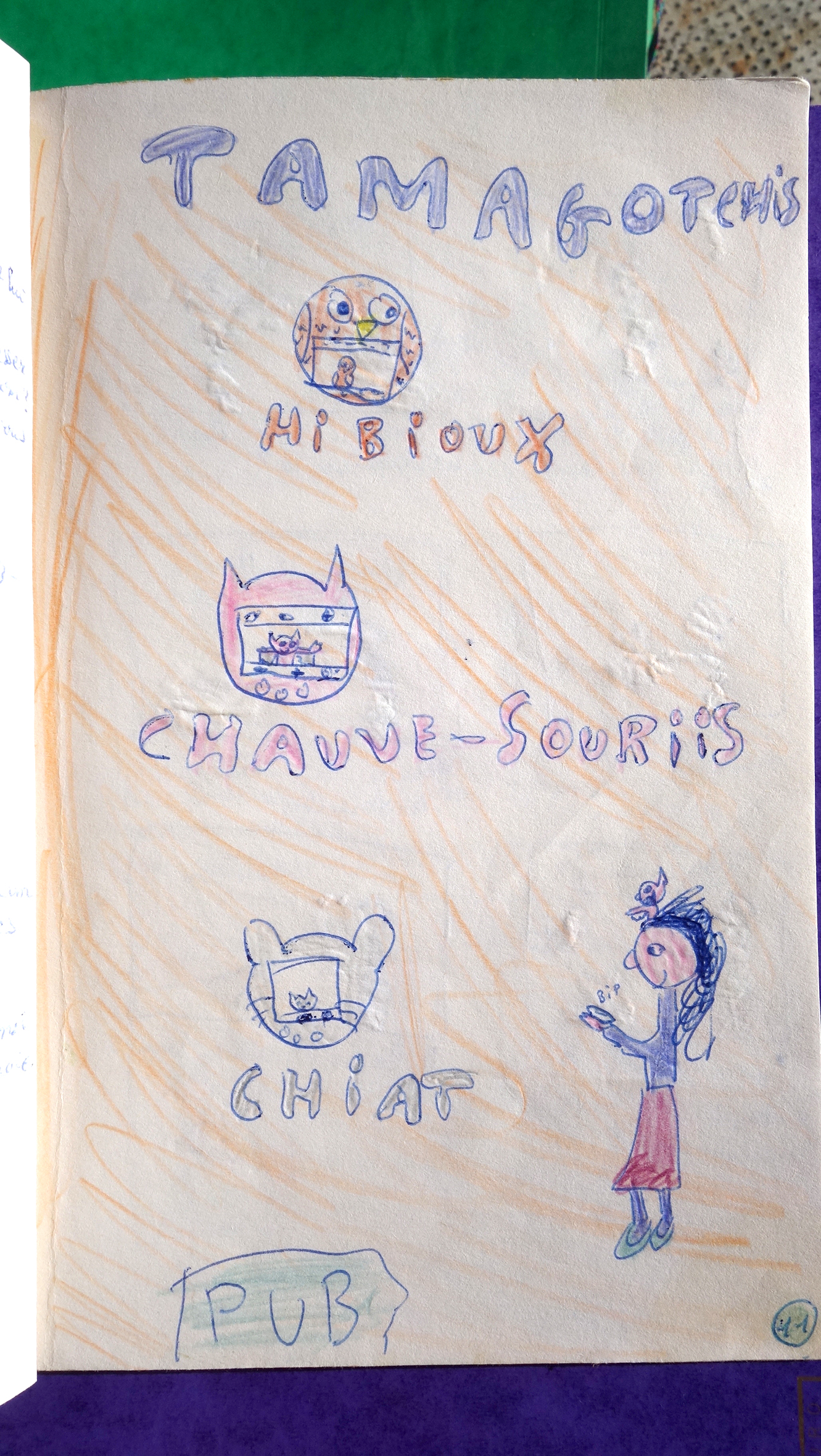 Et bien sûr, observation, inspiration… On continue les univers qui nous plaisent. Ci-dessous, dans l’ordre : Rougemuraille, Harry Potter, Le manuel des Castors Juniors, les Tamagotchis (je ne sais pas si tu connais, c’était la super mode dans la cour de récré, mais je n’avais pas pu en avoir un, alors j’en ai imaginé).