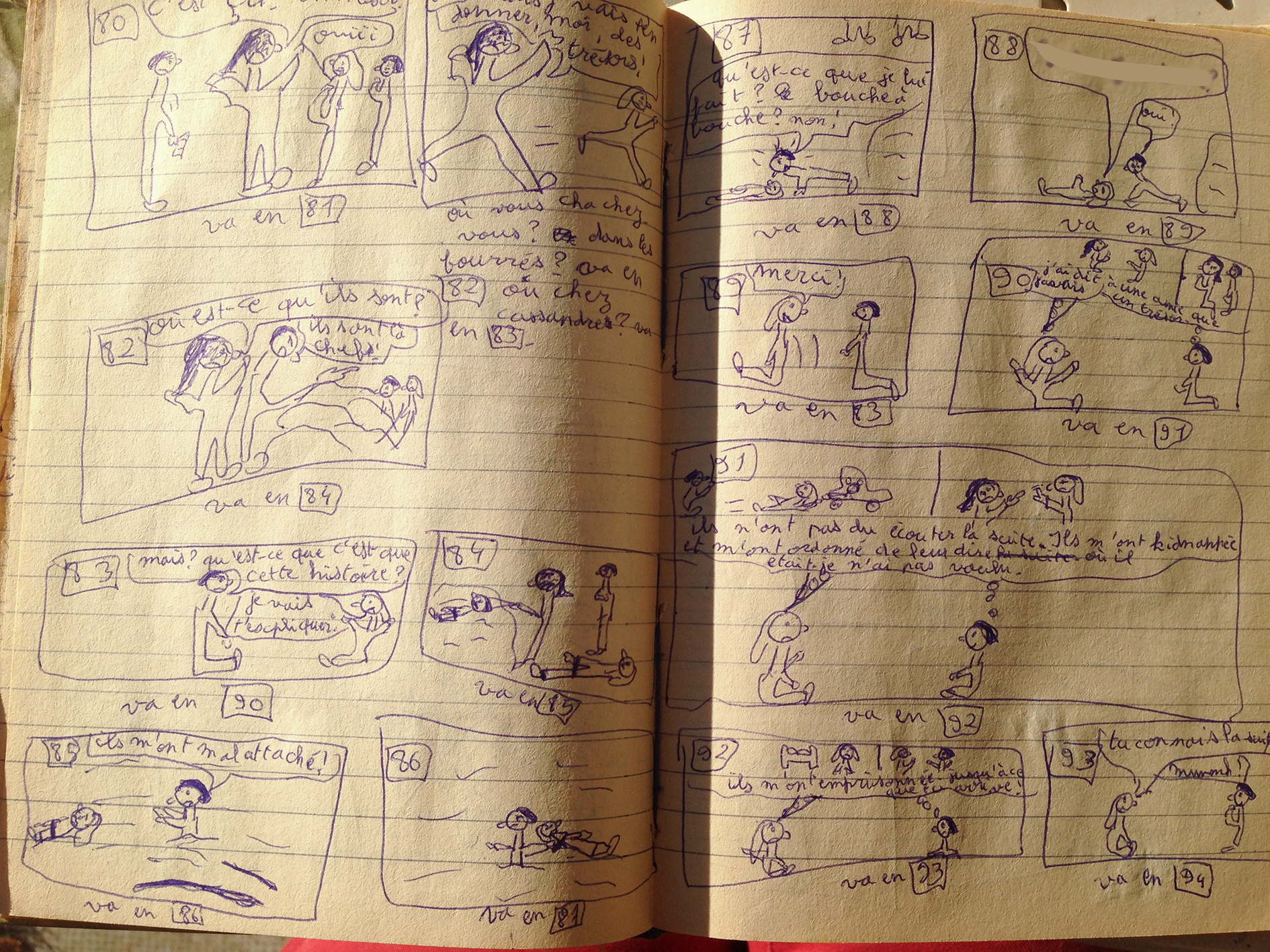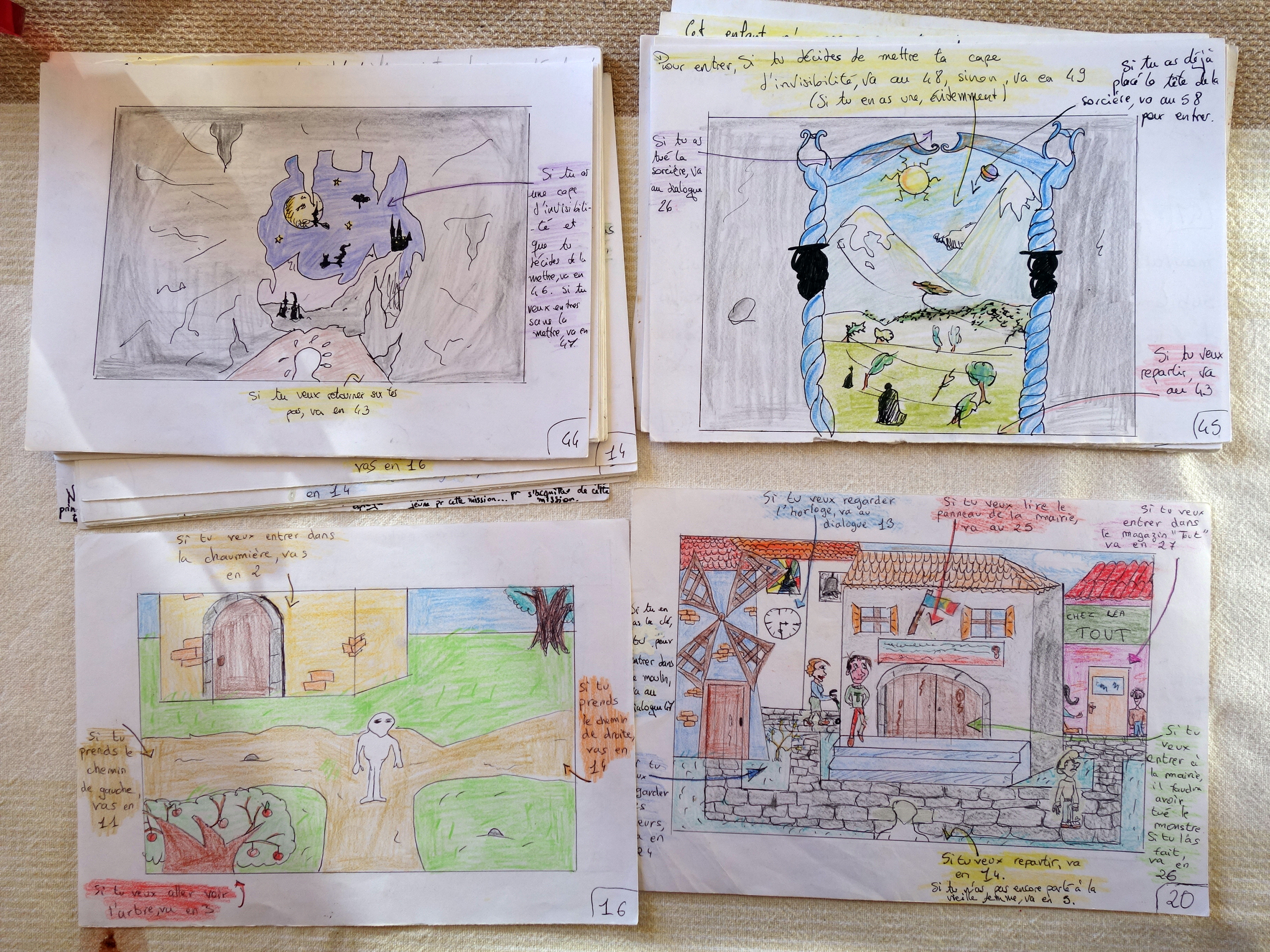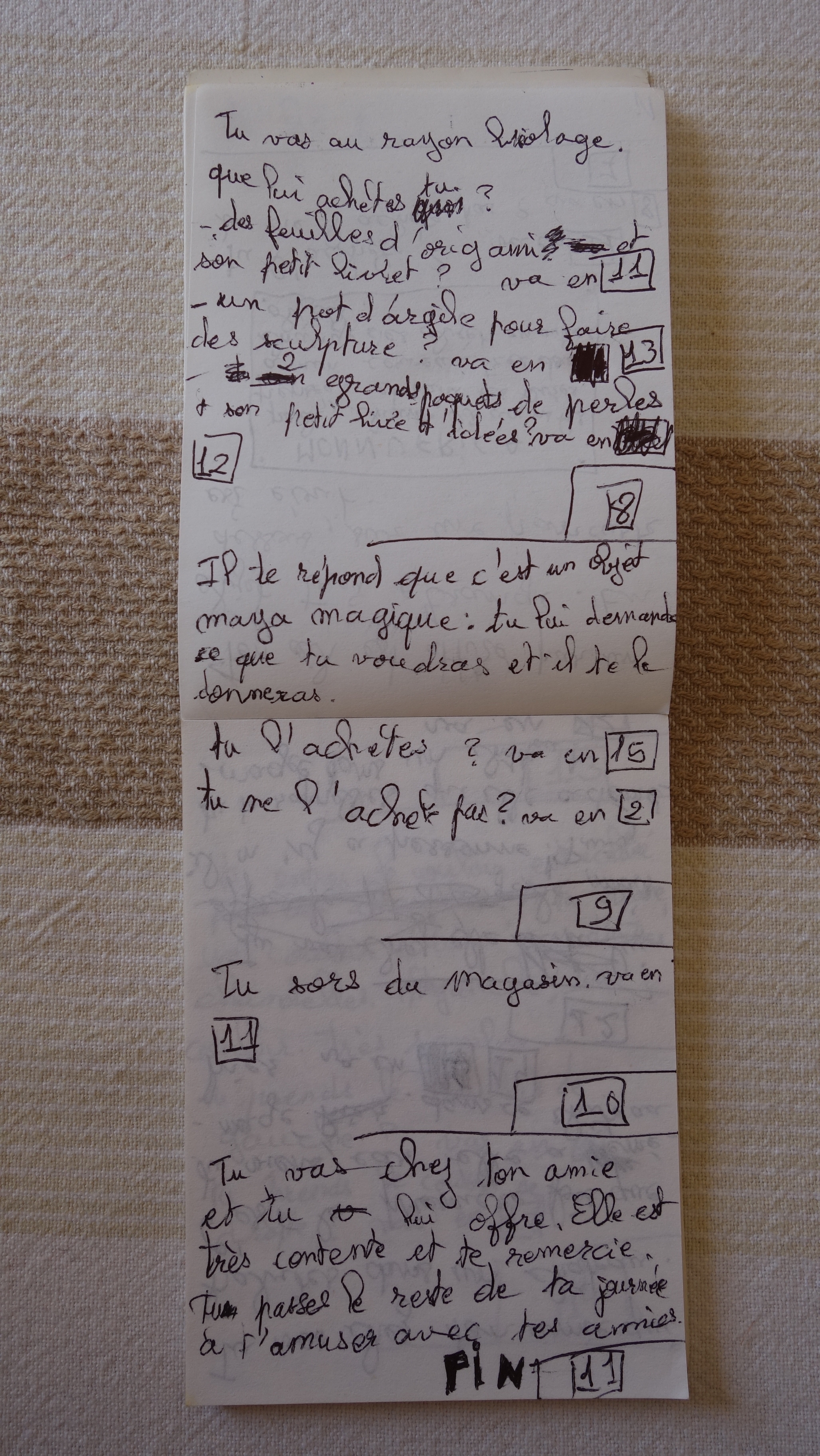 6 ans plus tard, aux Beaux-Arts, mon prof de multimédia qui s’appelait Étienne Cliquet, m’a incitée à le transposer en web. Il y a donc maintenant une version interactive au clic, et pas au tourné de page :) Mais ce n’est pas encore automatique, car il y a des « si » à lire, pour cliquer au bon endroit : « si tu as déjà rencontré la vieille femme, clique ici, sinon clique là ». Peut-être à améliorer pour la prochaine version, dans un vrai logiciel de jeu comme Unity?