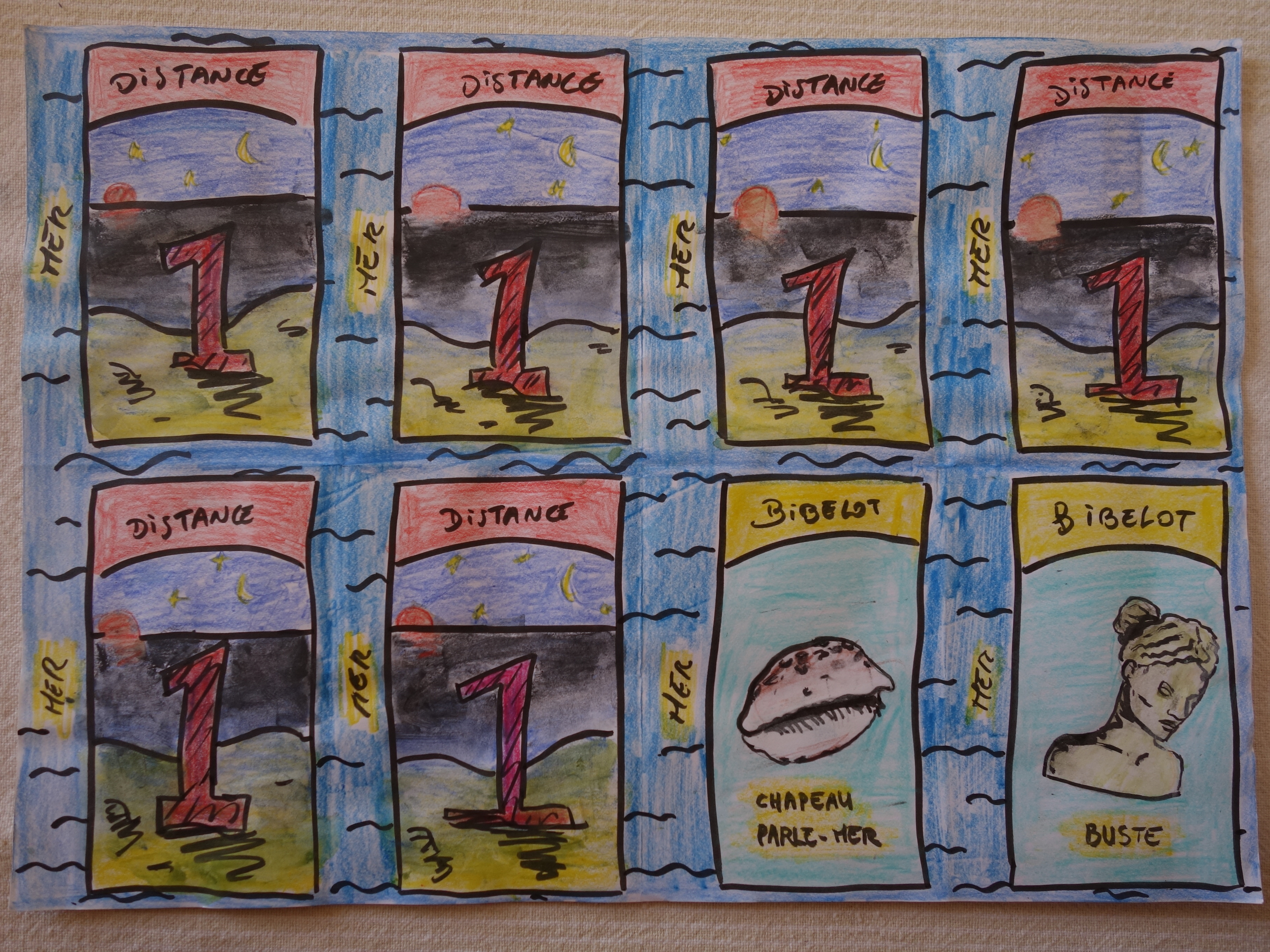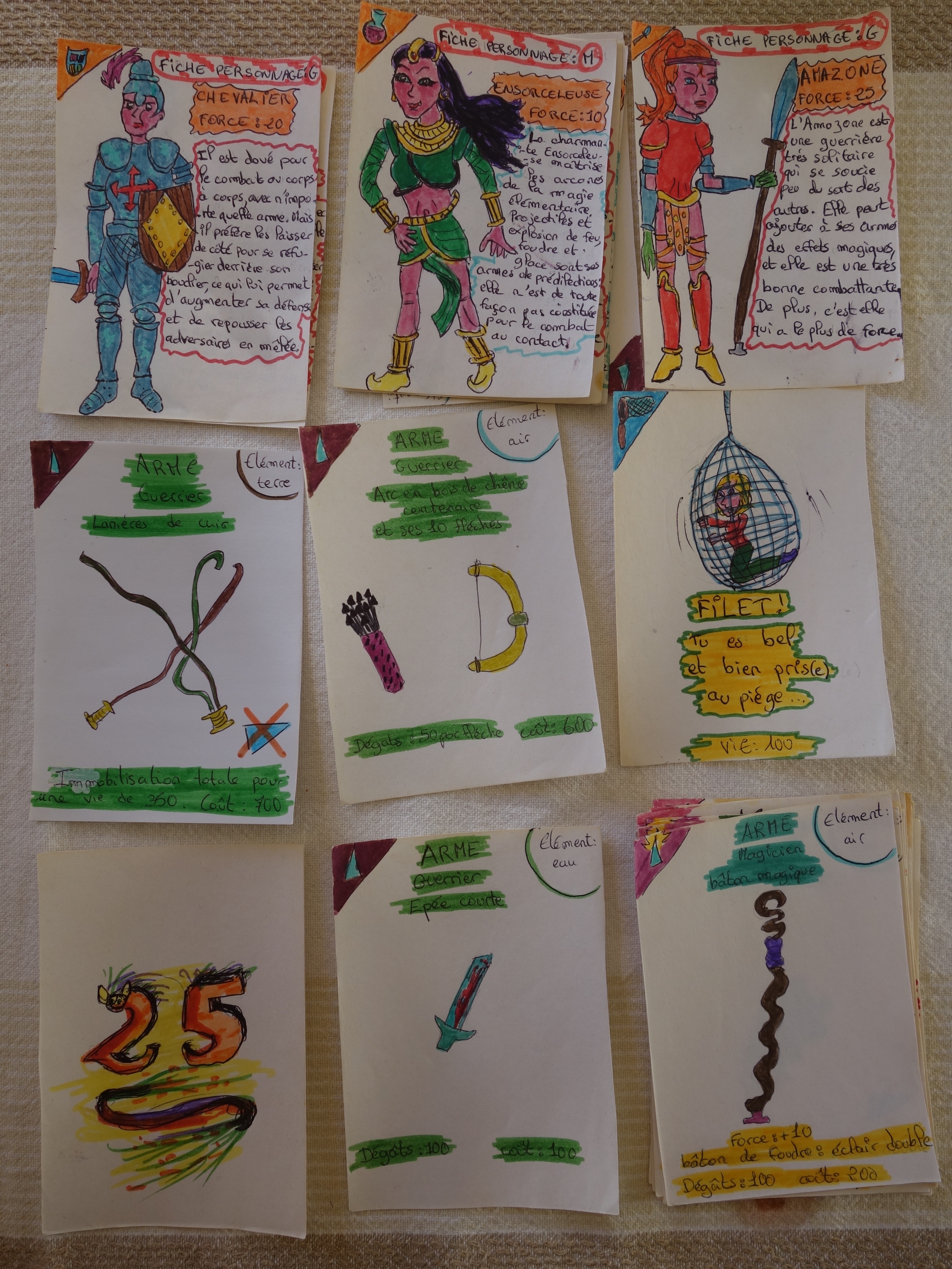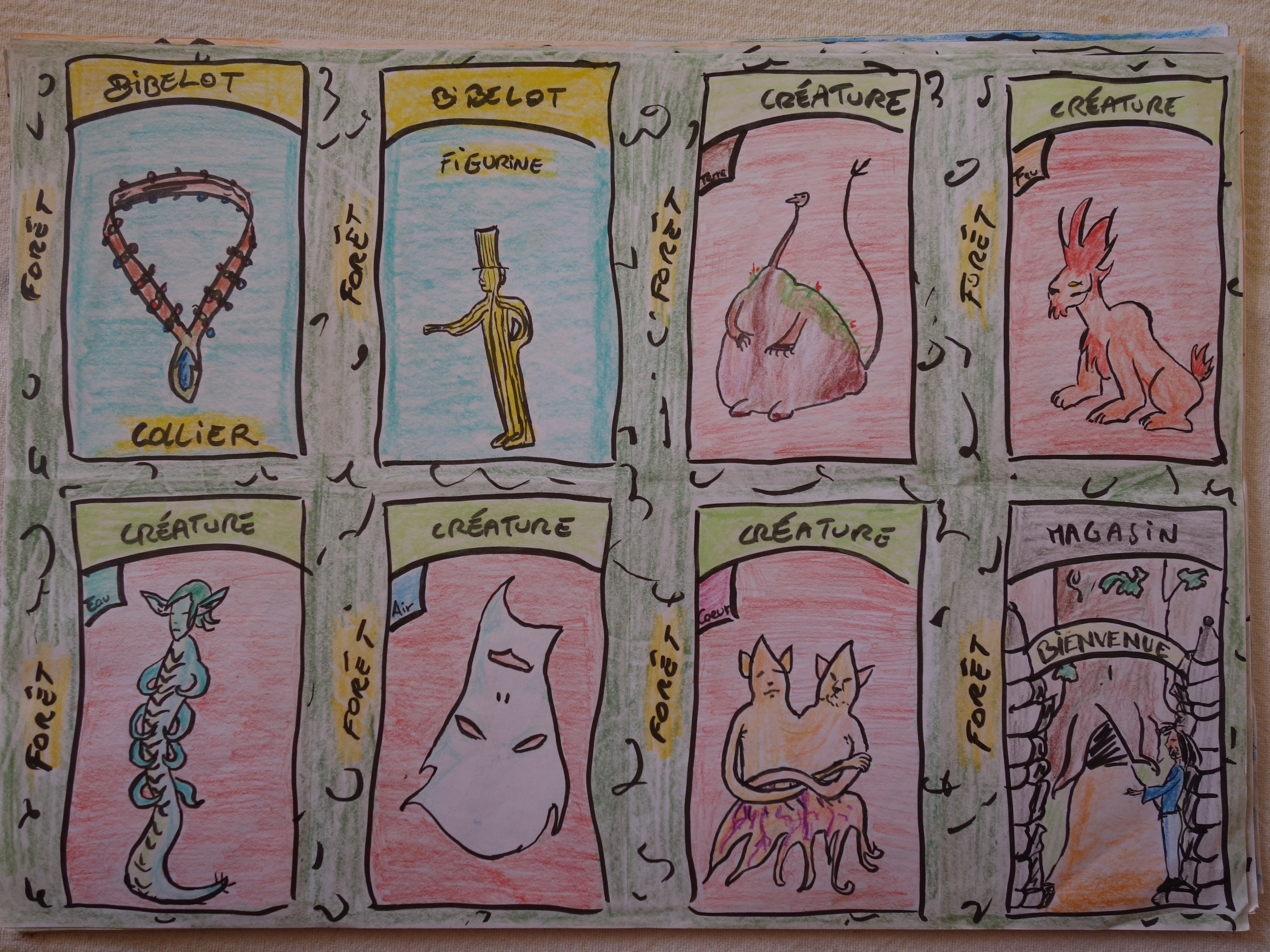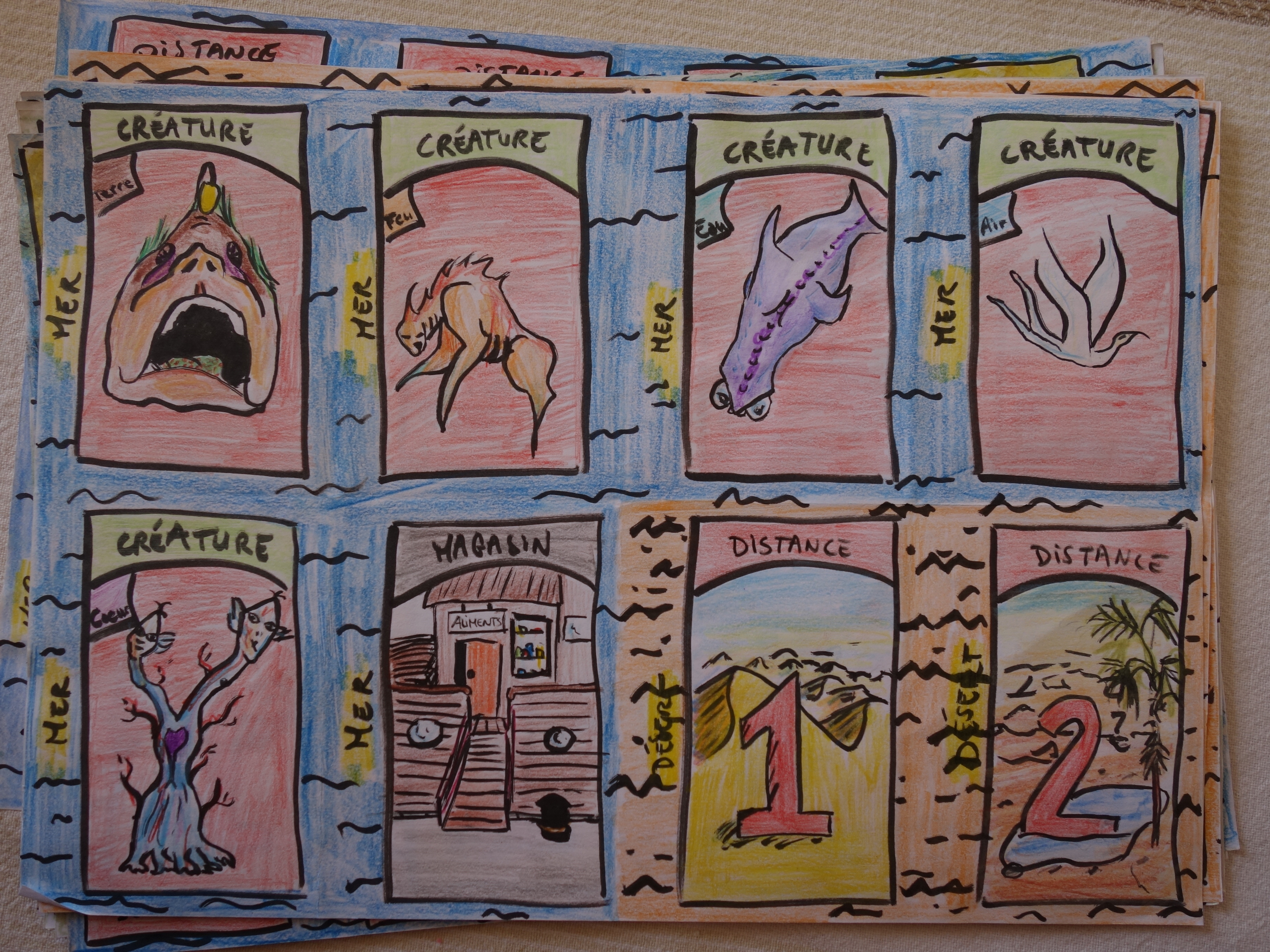 - Un jeu de cartes que j’aimerais bien finaliser, sur des territoires « glaces », « forêt », « jungle », « mer », « ville », « désert ». Il n’y a pas de pouvoir plus petit que les autres, chacun en vainc un autre. Il faut que je me replonge dans les règles :)