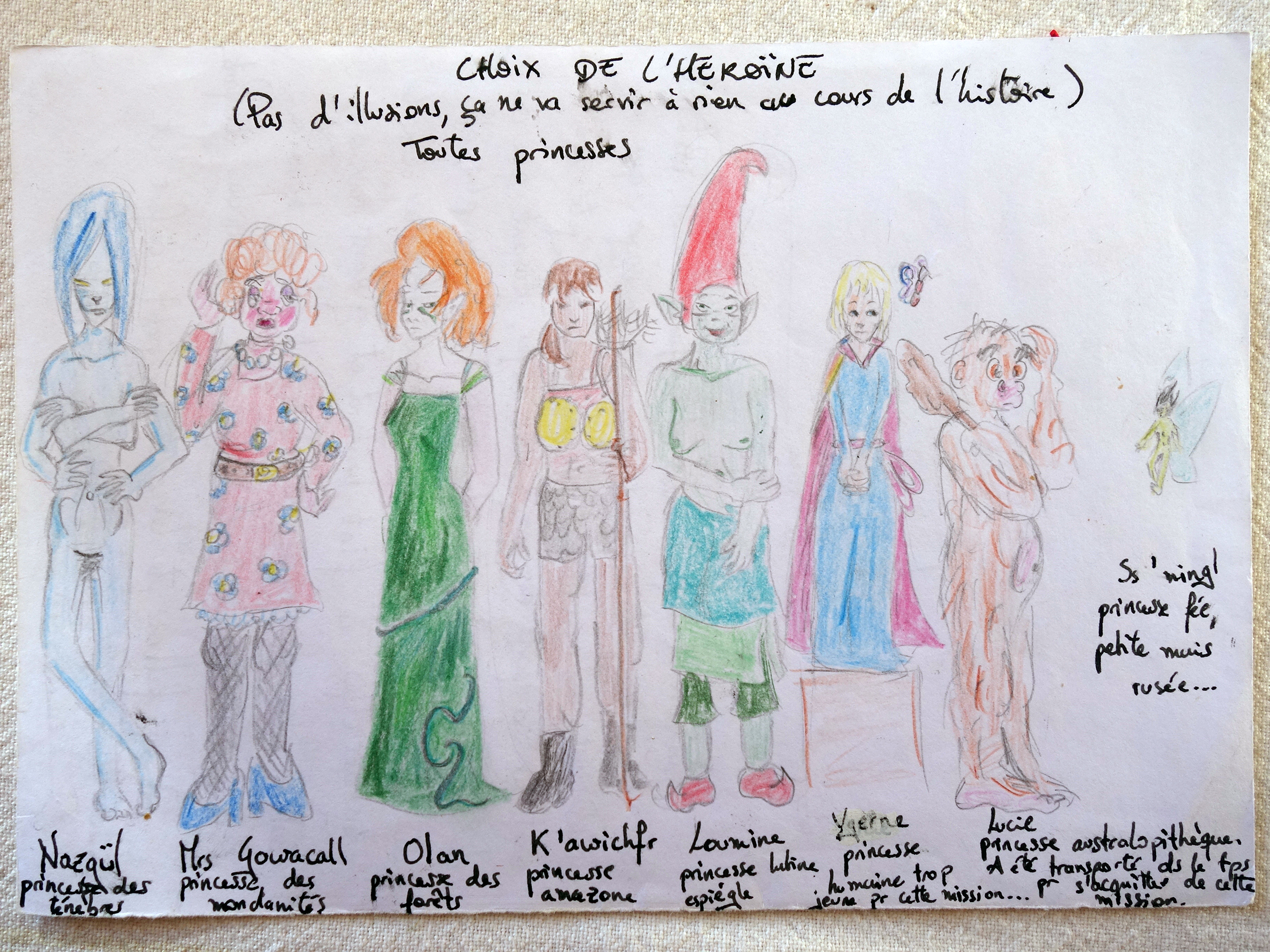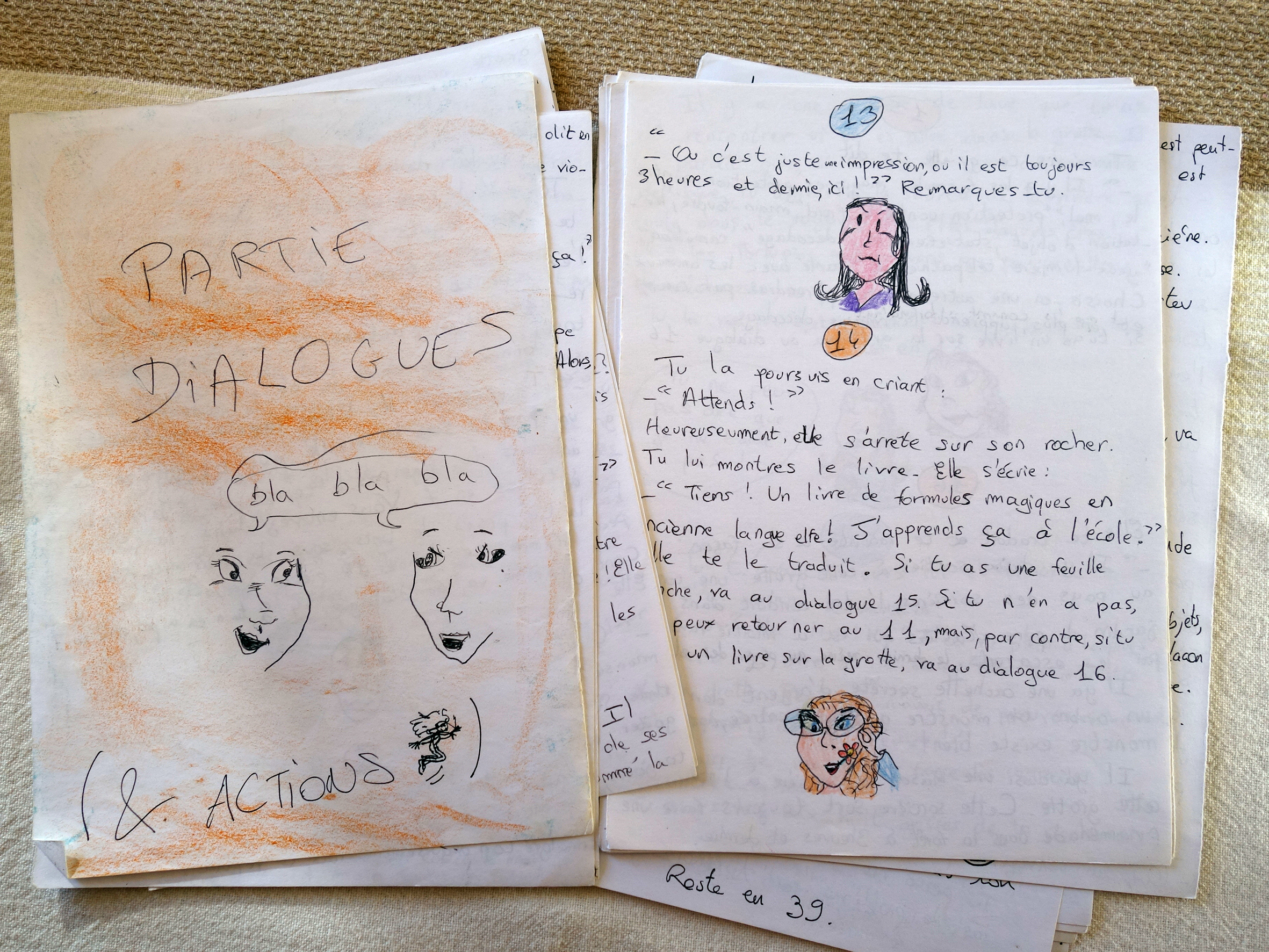 Et donc, dans ces projets pas finis-refinis, je suis tout de même très contente d’avoir finalisé un jeu d’aventure, que je t’ai déjà envoyé il me semble. C’est comme un livre dont vous êtes le héros/ l’héroïne, mais où j’ai décidé d’ajouter des images, comme dans un jeu vidéo. Donc il y avait une marge qui me permettait de noter où cela renvoyait si on choisissait cette option (soit vers une autre scène, soit vers la partie dialogue). Au début, j’avais 10 ans, comme sur la première image, « partie dialogues » ainsi qu’en bas de la 3e. Puis j’ai repris ce projet à 14 ans, comme sur la deuxième image, « choix de l’héroïne », et en haut de la 3e. Mais dès la base, pour autoriser au joueur ou à la joueuse de se projeter dans le personnage principal comme il le voulait, j’avais fait juste une silhouette blanche.