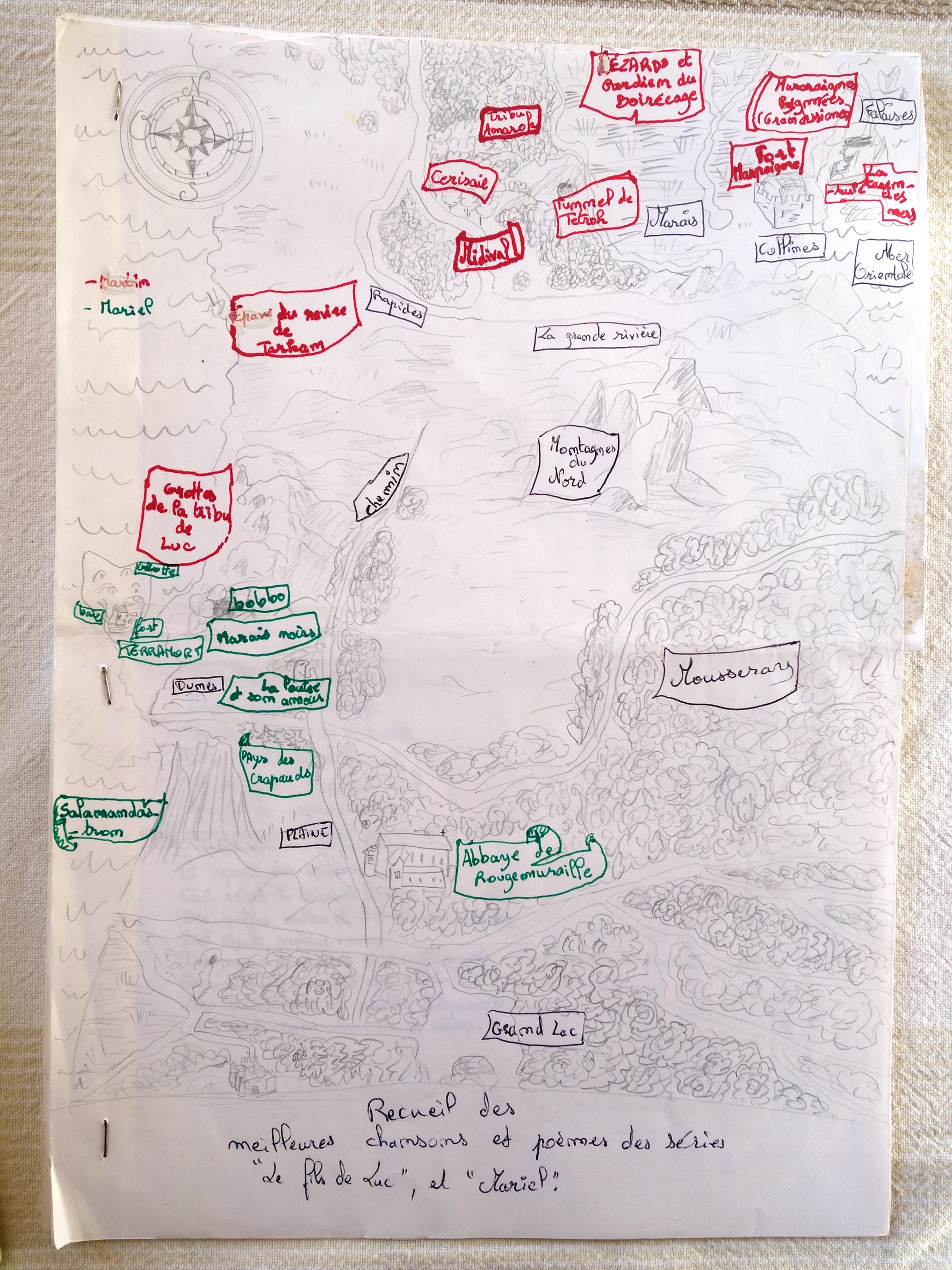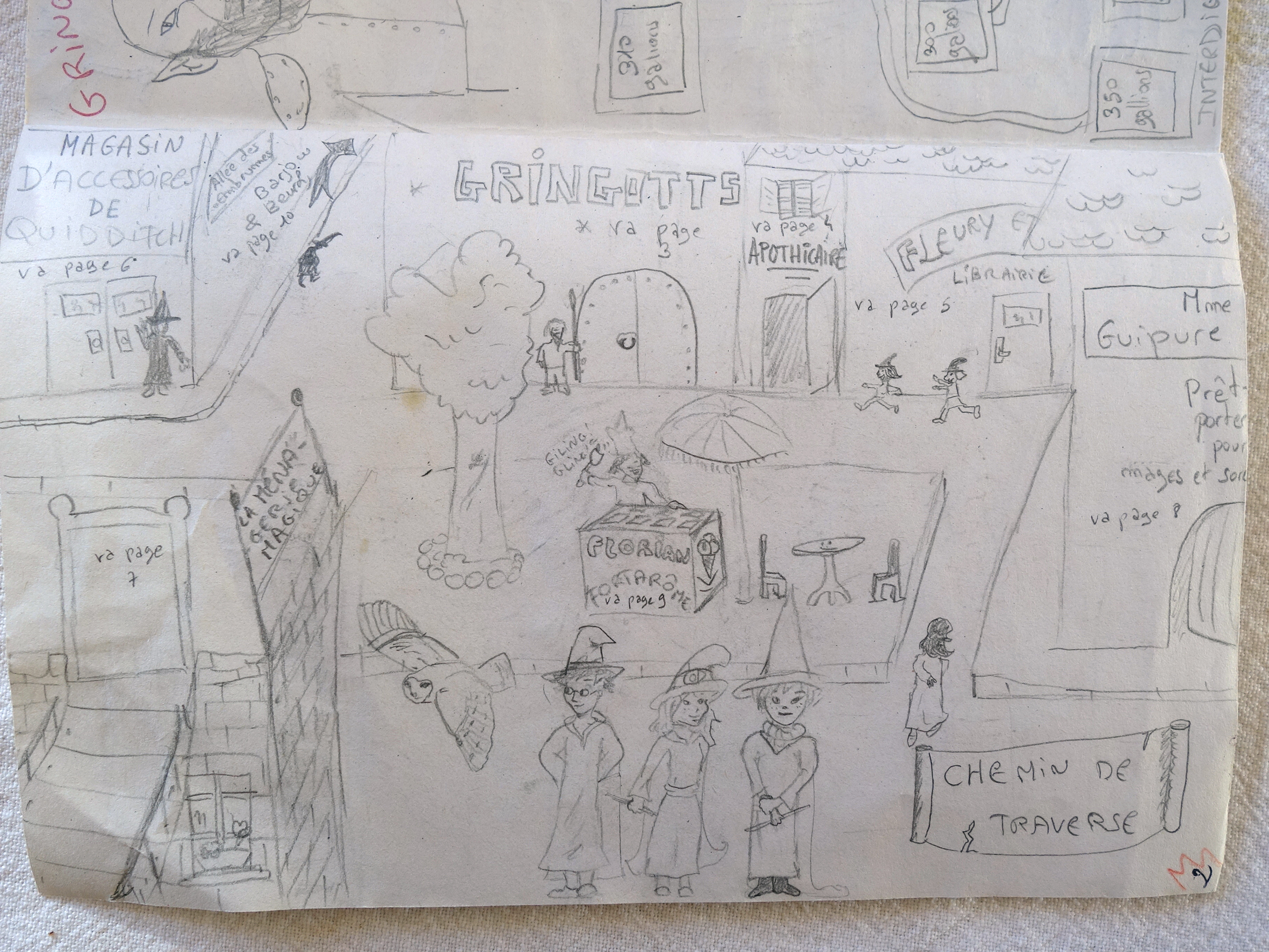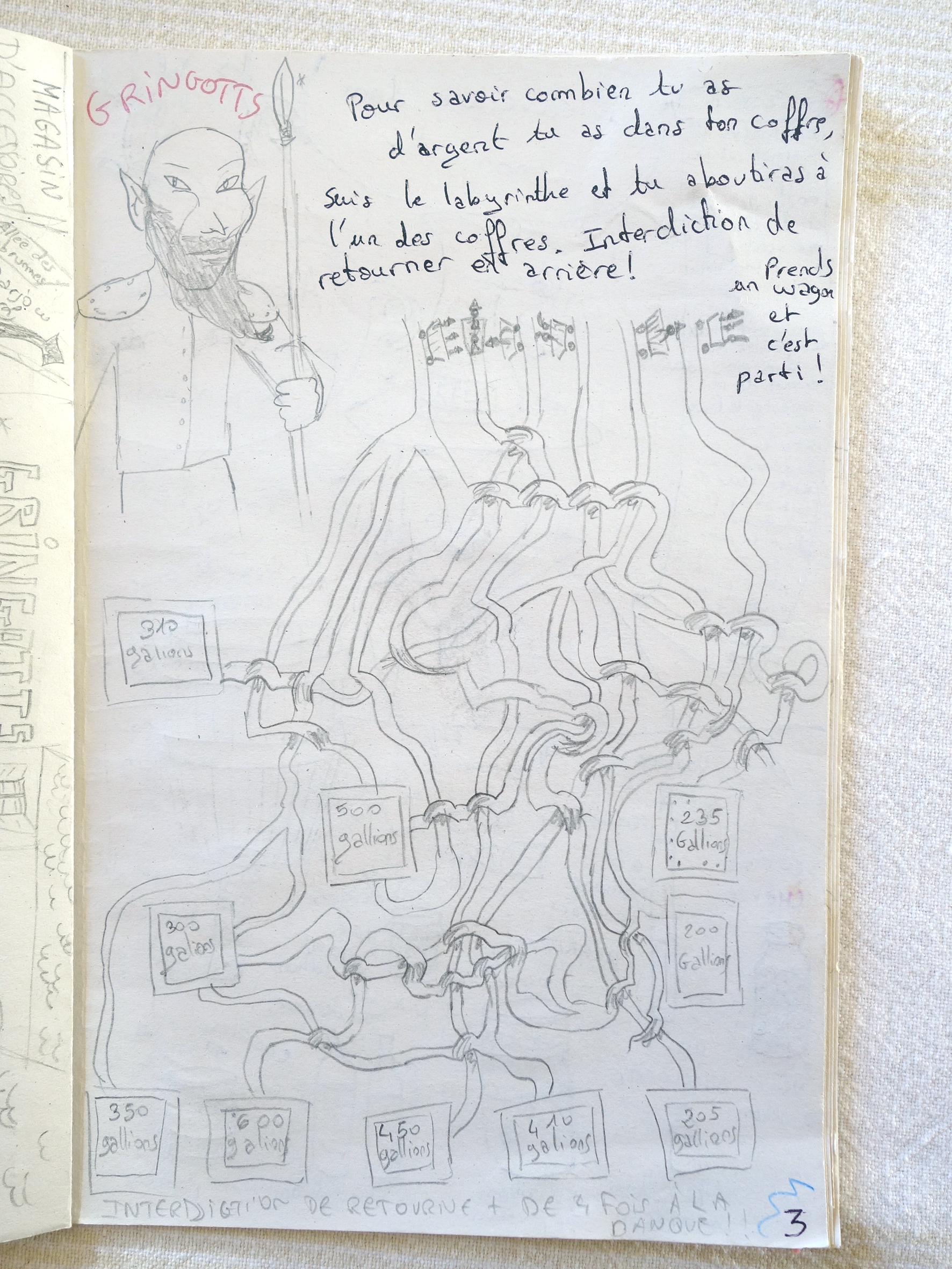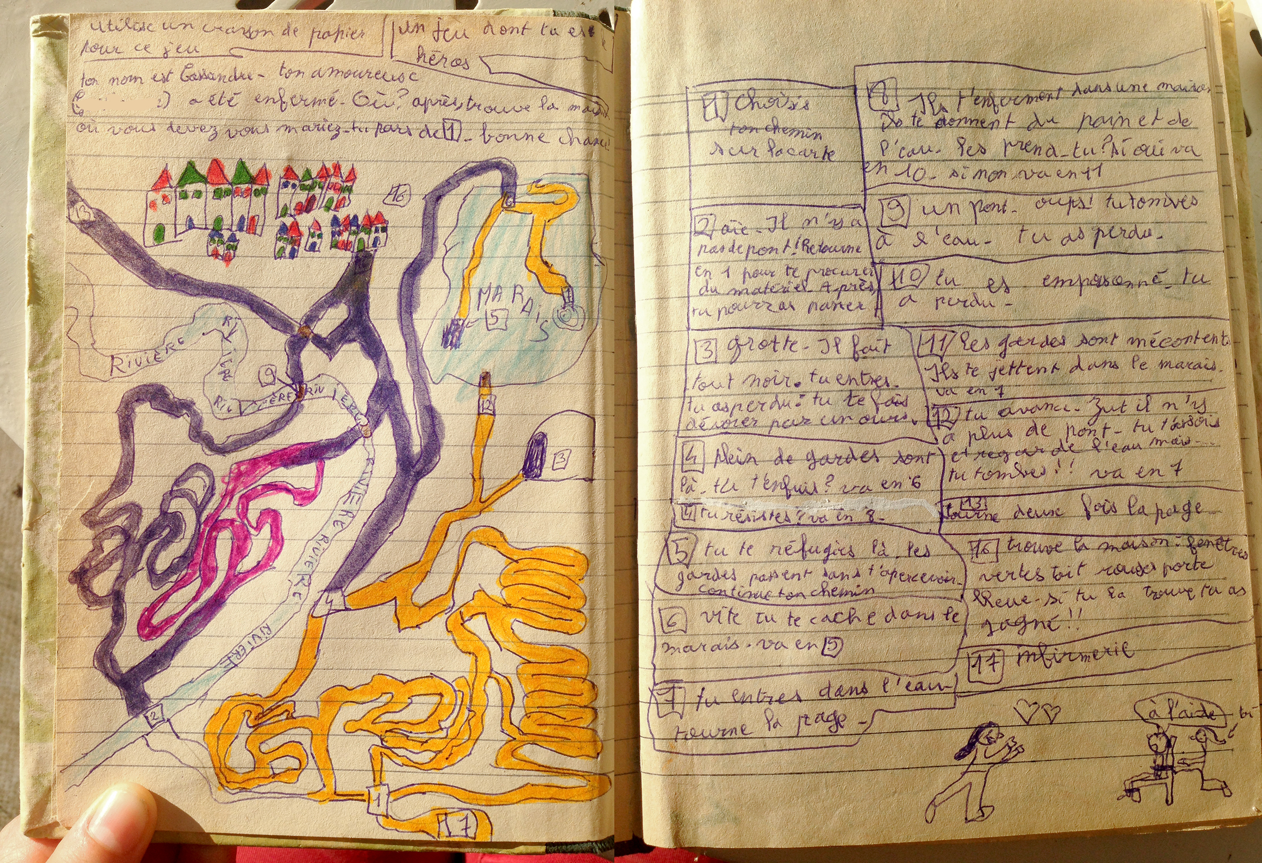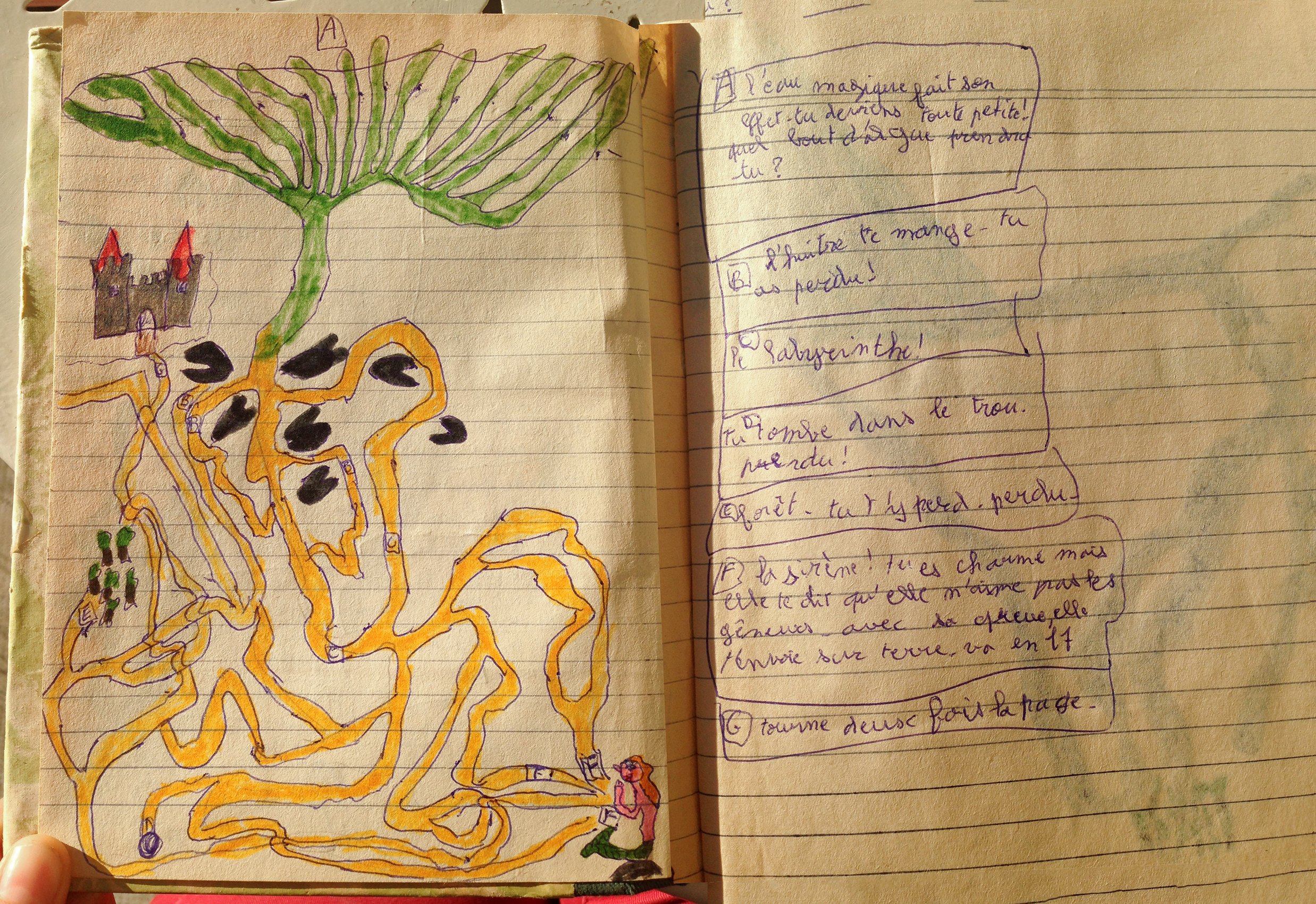Et bien sûr, il y a tout ce que j’ai appelé plus tard « les jeux de papier vidéo »… C’est-à-dire, tous les jeux vidéo que je faisais en papier. Je ne les ai pas tous retrouvés. Je me souviens notamment d’une grande carte à assembler, à l’univers narratif inspiré du jeu vidéo « Sortilèges » (mince je regarde cette vidéo de gameplay, c’est trop moche mais j’ai super envie d’y rejouer) sur laquelle des mini carnets de dialogues étaient agrafés, à lire quand on passait à cet endroit-là.