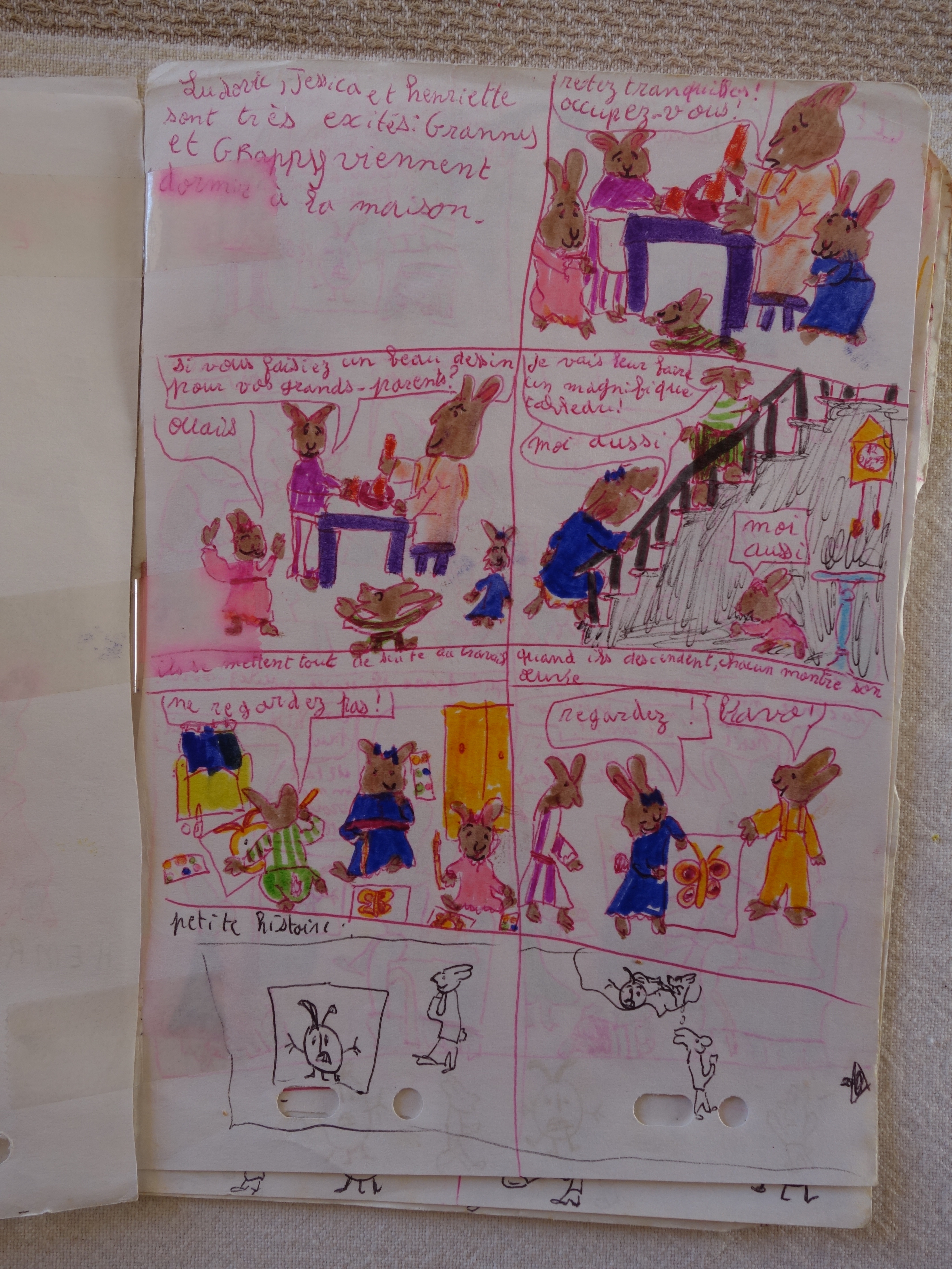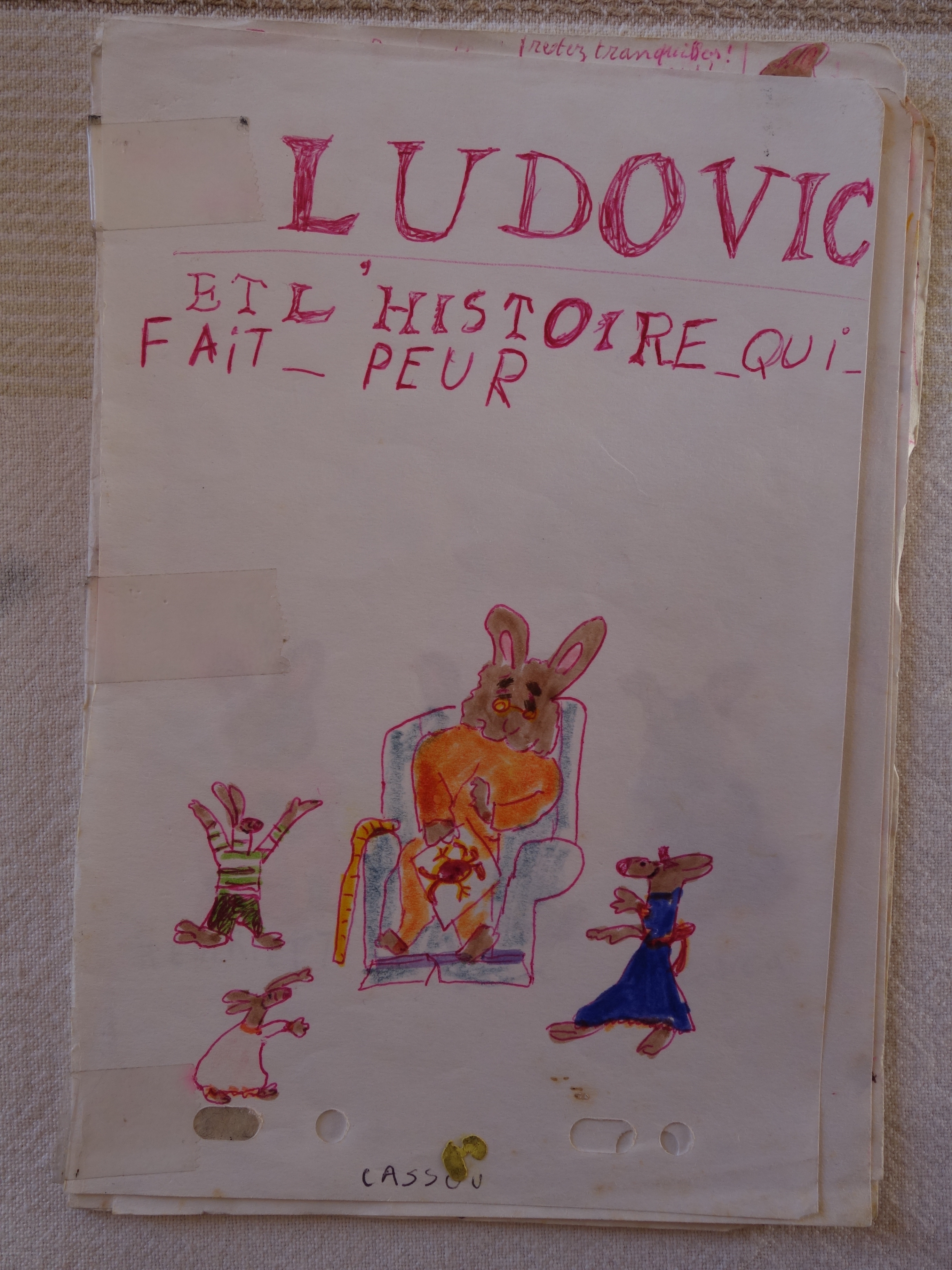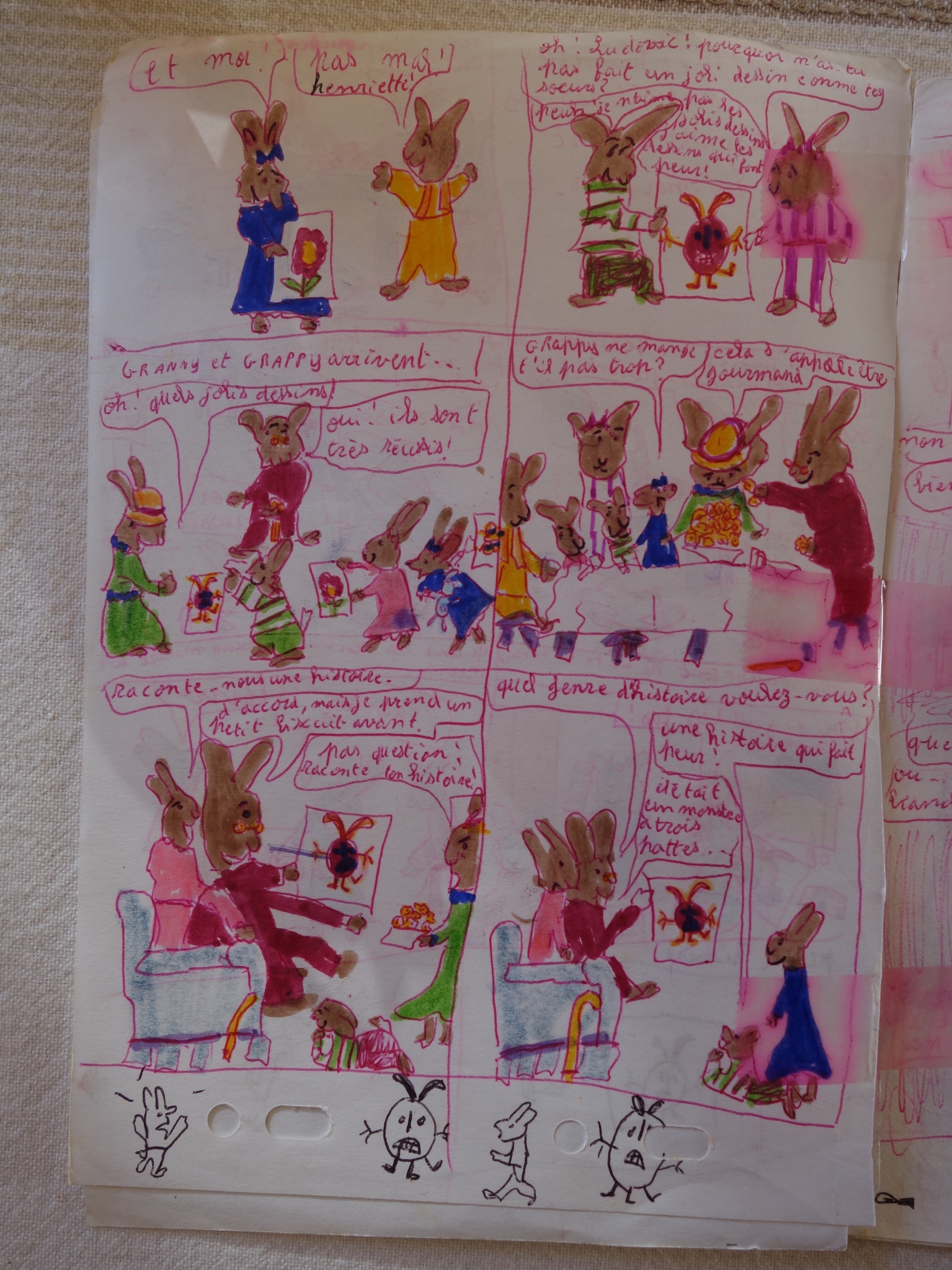 Par exemple, ci-dessous : c’est l’adaptation d’un album « Ludovic et l’histoire-qui-fait-peur » vers une bande dessinée. Je ne sais plus quel âge j’avais quand j’ai fait ça. Du coup, ça permet de prendre appui sur les dessins de base, pour inventer le mouvement à partir de là. À noter que je dessinais d’abord la grille de BD (mal), et du coup il me restait deux petites cases en bas parce que je ne faisais pas attention. Alors j’ai décidé de faire une BD parallèle qui se lit de page en page, seulement sur les deux cases du bas ^^