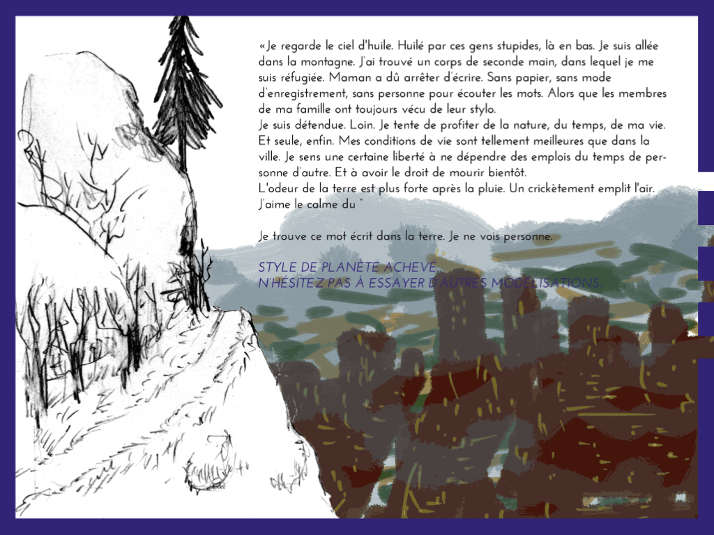 Terre de Grâce est une toute petite planète que le Dieu-lecteur est amené à faire évoluer. Le lecteur a des propositions d’éléments à ajouter à la planète, et après chacun de ses choix, il assiste à leur impact. Mais la Terre de Grâce est loin d’être aussi harmonieuse qu’il pourrait le vouloir, et ses choix ont des conséquences imprévisibles… Par la prise en main active de l’iPad et sa manipulation, le lecteur peut regarder dedans comme dans une boîte, faire surgir des scènes cachées, observer les scènes de vie sur la planète. Le projet est présenté en l’état de prototype.
